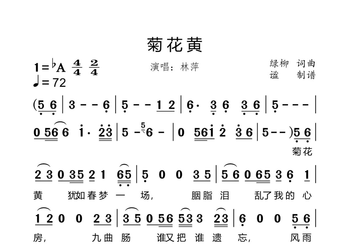 《菊花黄》是林萍演唱的一首歌曲,拍号为4/4拍,歌曲速度为每分钟72拍,这份简谱共有两张高清图谱,图谱由 @谧 编配上传林萍 《菊花黄》原版简谱。