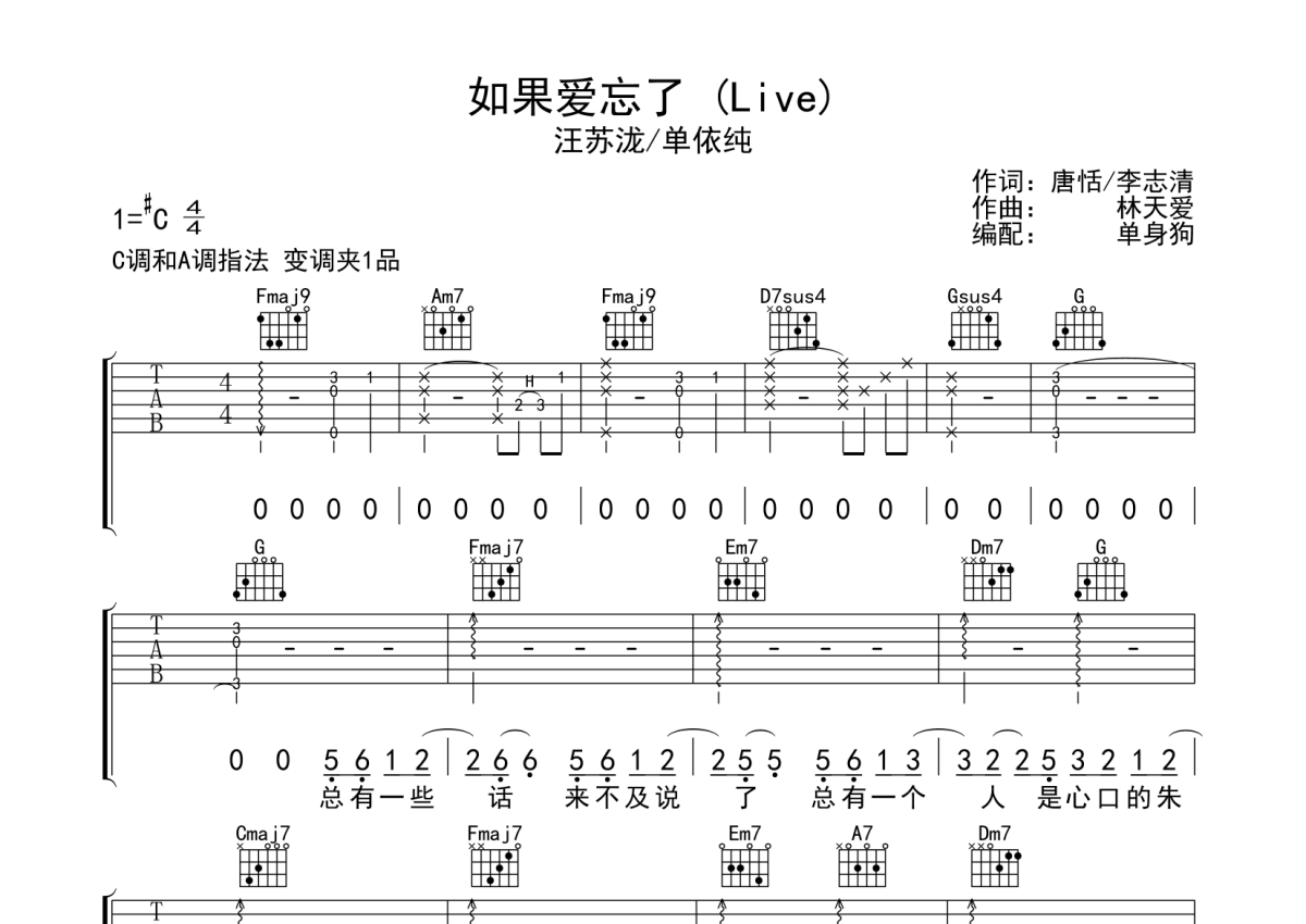 汪苏泷/单依纯《如果爱忘了 (Live)》吉他谱 - C调弹唱六线谱