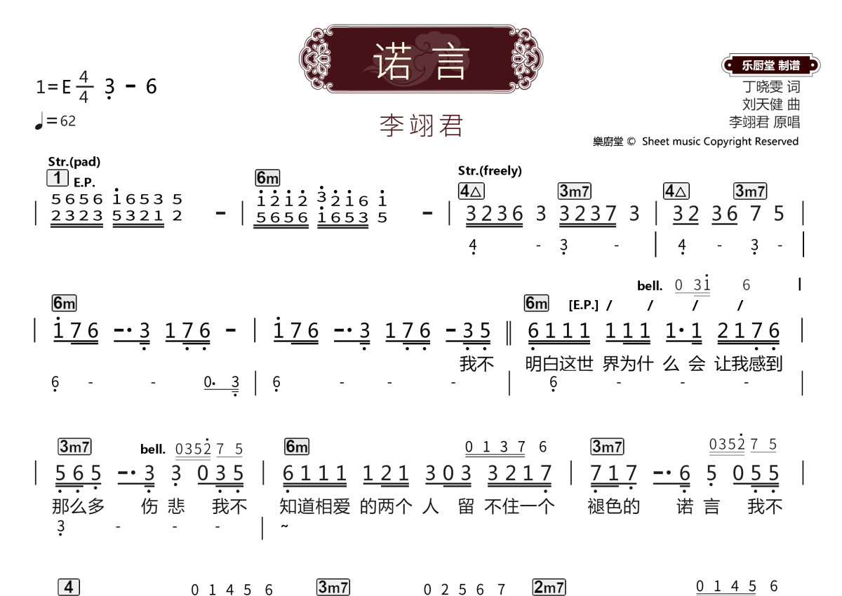 《诺言》是李翊君演唱的一首歌曲,拍号为4/4拍,这份乐队总谱共有两张高清图谱,图谱由 @乐厨堂 编配上传。