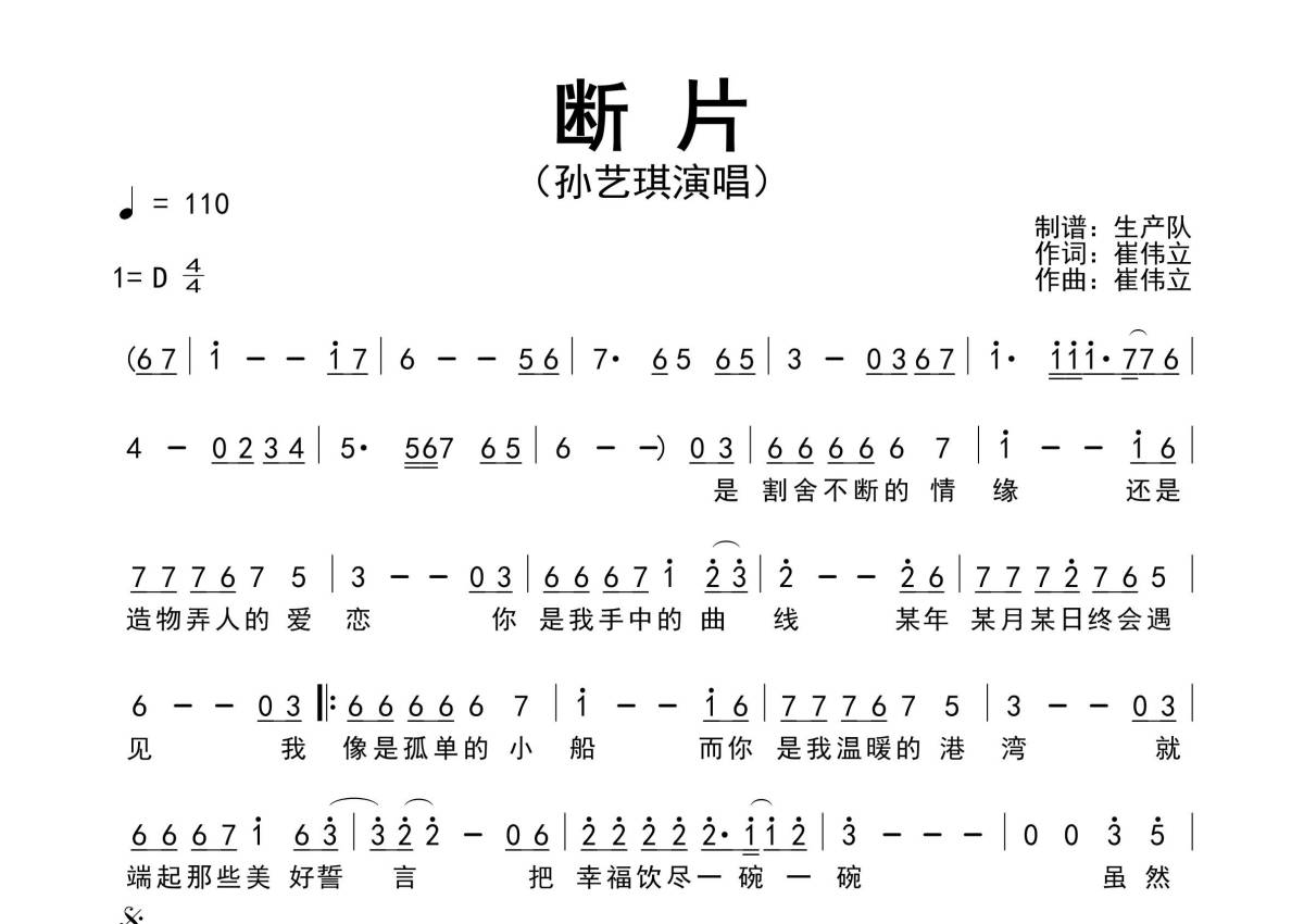 《断片》是孙艺琪演唱的一首歌曲,原版简谱,拍号为4/4拍,歌曲速度为每分钟110拍,这份简谱共有一张高清图谱,图谱由 @生产队 编配上传孙艺琪演唱的歌曲《断片》原版简谱。