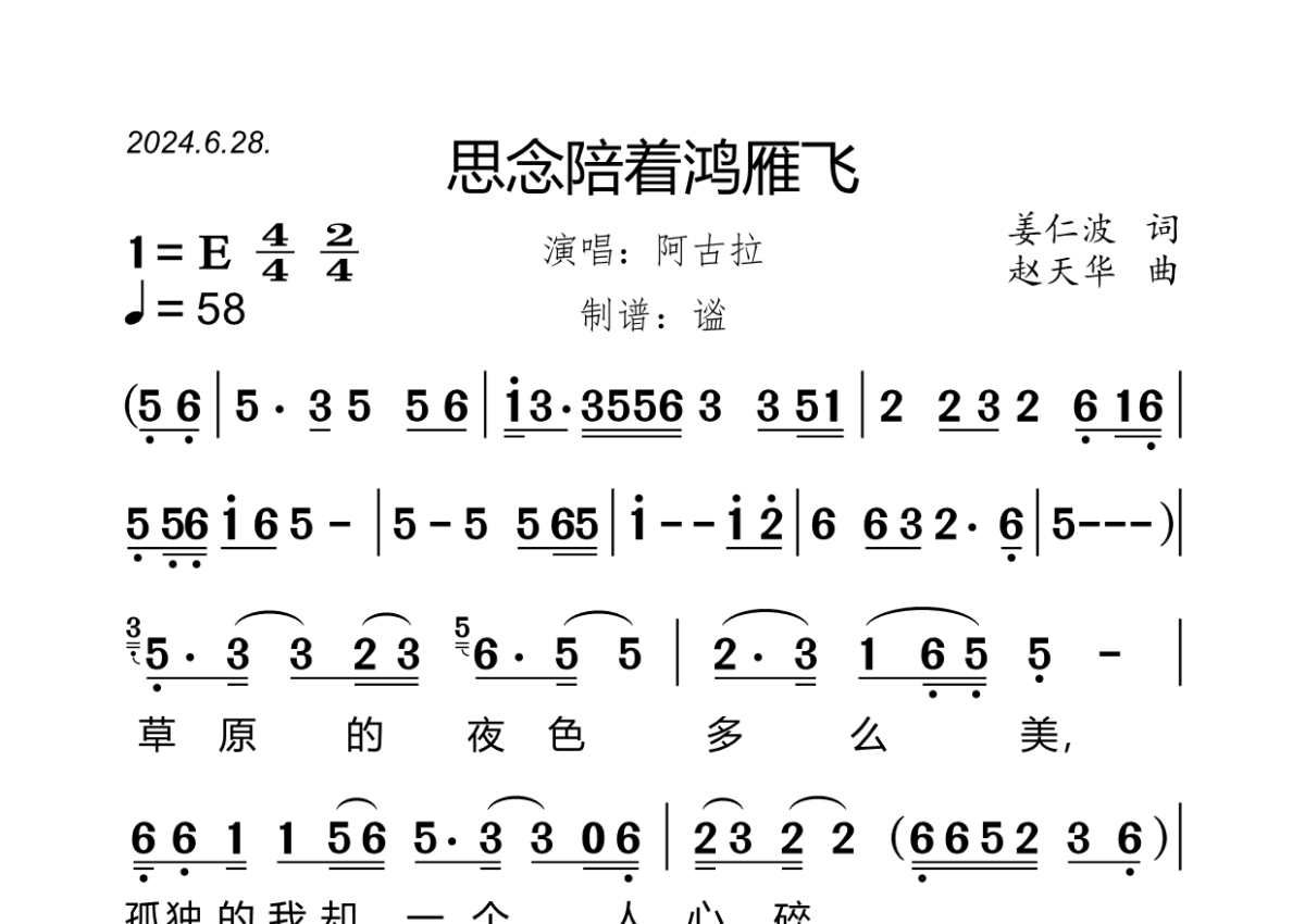 《思念陪着鸿雁飞》是阿古拉演唱的一首歌曲,拍号为4/4拍,歌曲速度为每分钟58拍,这份简谱共有三张高清图谱,图谱由 @谧 编配上传阿古拉 《思念陪着鸿雁飞》原版简谱。