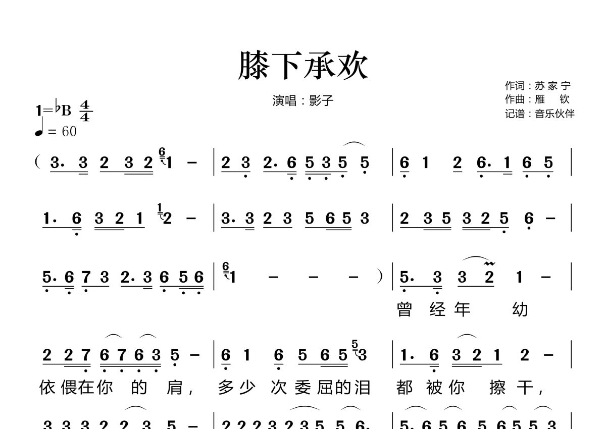 《膝下承欢》是影子演唱的一首歌曲,这份简谱共有两张高清图谱,图谱由 @音乐伙伴 编配上传。