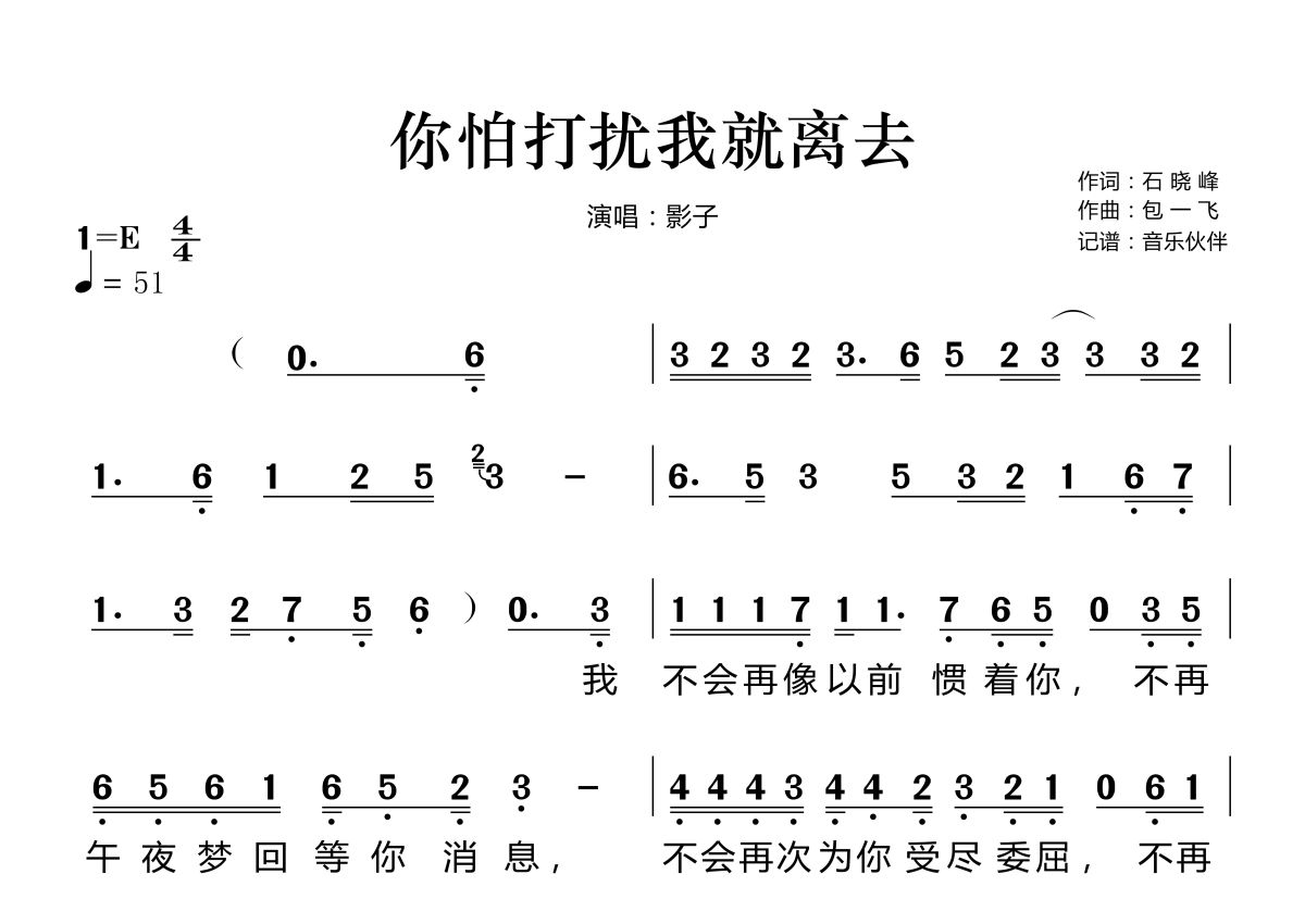 《你怕打扰我就离去》是影子演唱的一首歌曲,这份简谱共有两张高清图谱,图谱由 @音乐伙伴 编配上传。