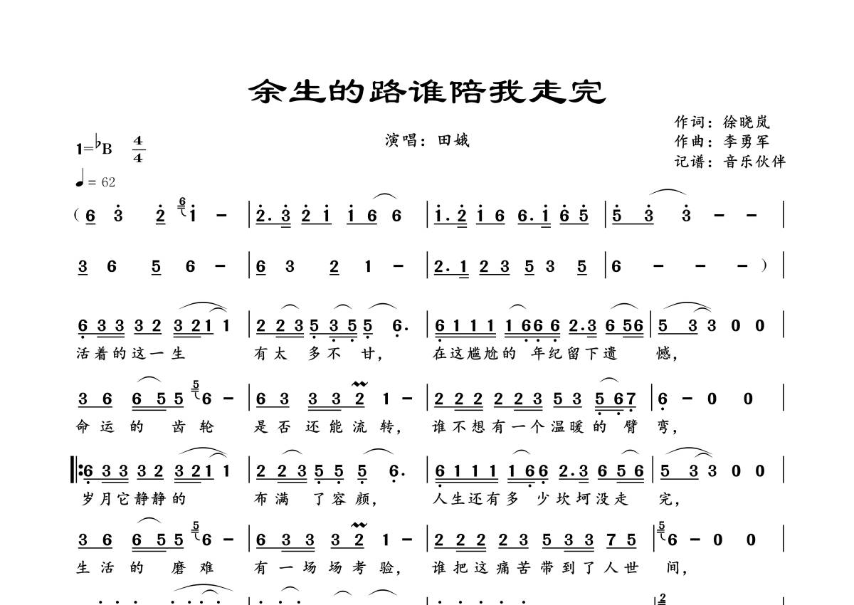 《余生的路谁陪我走完》是田娥演唱的一首歌曲,拍号为4/4拍,歌曲速度为每分钟62拍,这份简谱共有一张高清图谱,图谱由 @音乐伙伴 编配上传。