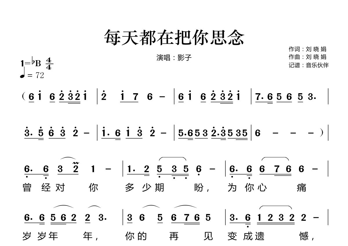 《每天都在把你思念》是影子演唱的一首歌曲,这份简谱共有两张高清图谱,图谱由 @音乐伙伴 编配上传。