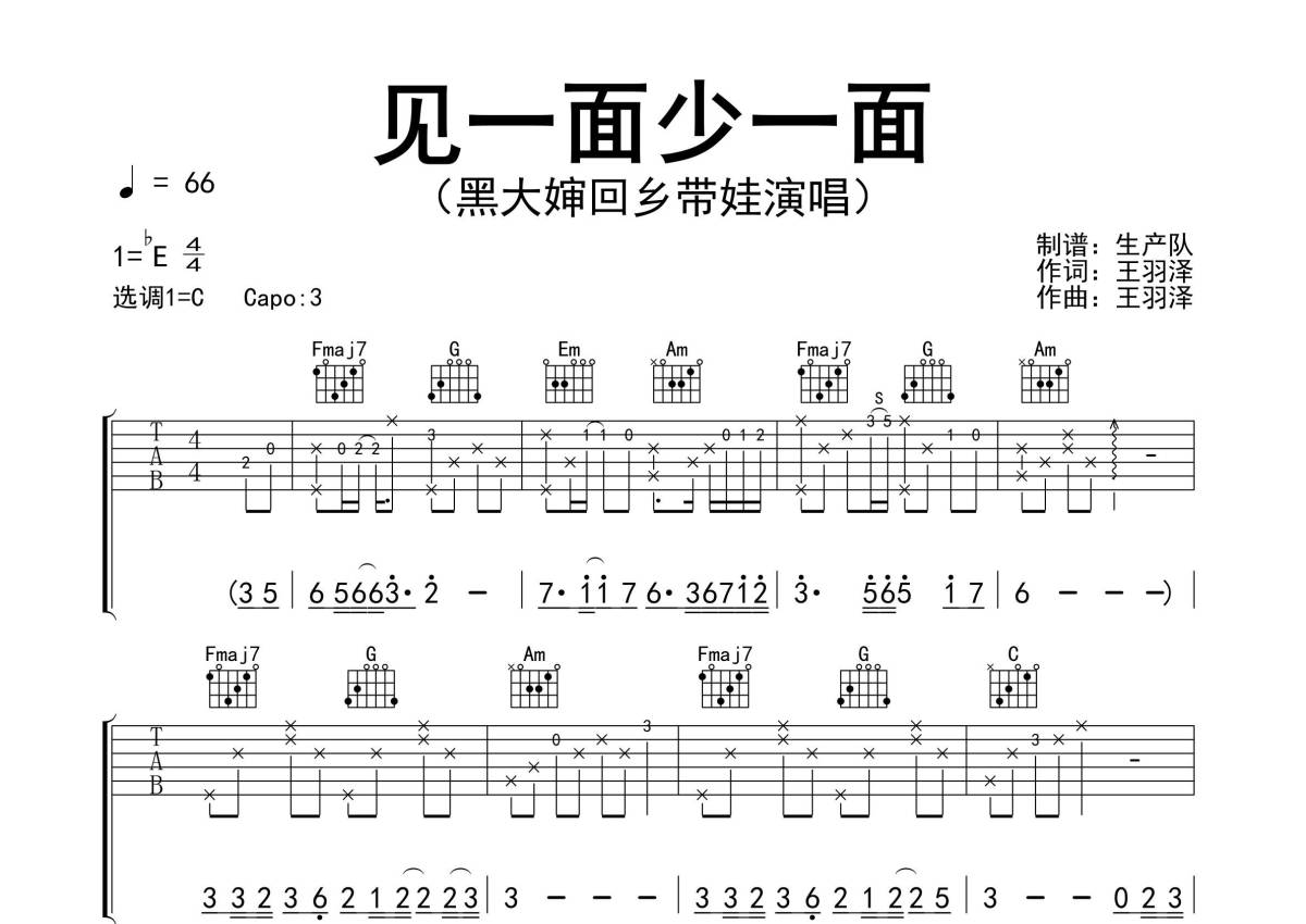 《见一面少一面》是黑大婶回乡带娃演唱的一首歌曲,精编完美版,拍号为4/4拍,歌曲速度为每分钟66拍,歌曲原调为Eb调,但由于原调指法比较难,为了方便弹奏,本吉他谱采用的是C调指法编配,变调夹3品弹奏即为原调,当然也可以根据自己的音域改变变调夹位置,或者通过改变和弦调性,以方便自己弹奏,这份吉他谱共有三张高清图谱,图谱由 @生产队 编配上传,图谱使用六线谱编配,包含吉他和弦指法、简谱以及歌词部分,使用这份见一面少一面吉他谱,可以让你更加方便地掌握这首歌曲的弹唱技巧,快来尝试吧。《见一面少一面》是由黑大婶回乡带娃演唱的一首热门歌曲。本吉他谱根据C调指法编配,完整的前奏、间奏、尾奏和solo编配,精编完美版,值得推荐的佳作。有些人不会在遇见,能见一面就见一面,不是每一次的离别,都会等到重逢那天,有些人要多爱一点,手放开了就会走远,也许一个转身一辈子不见。