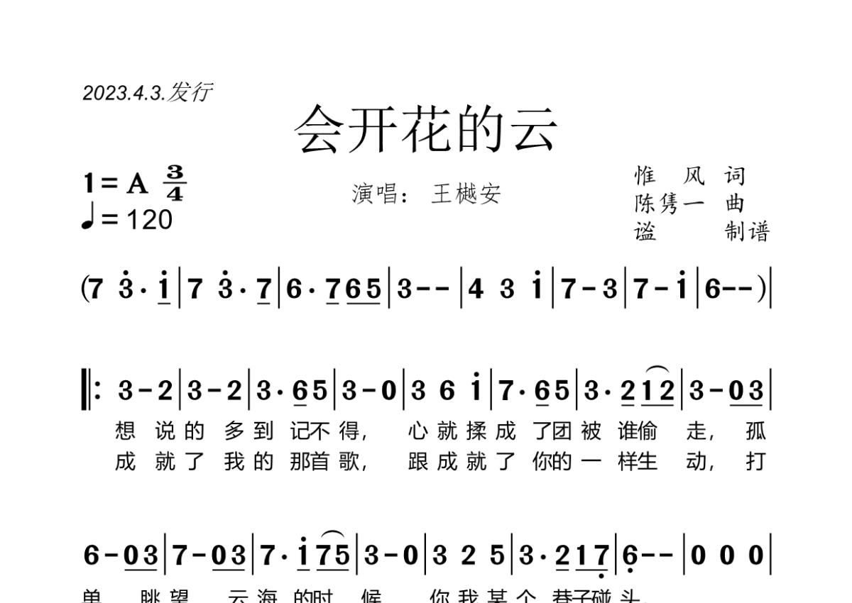 《会开花的云》是王樾安演唱的一首歌曲,拍号为3/4拍,歌曲速度为每分钟120拍,这份简谱共有两张高清图谱,图谱由 @谧 编配上传王樾安 《会开花的云》A调,3/4拍,速度120,共2页,谧精心制谱。