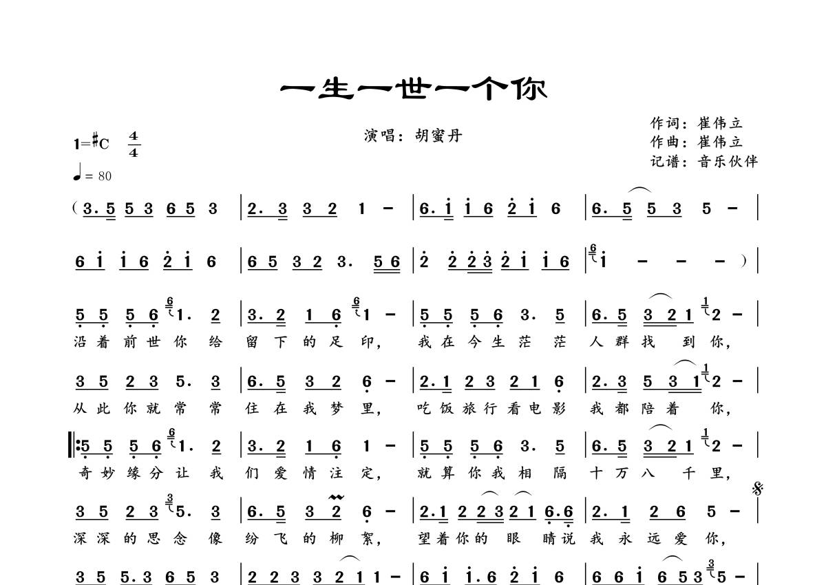 《一生一世一个你》是胡蜜丹演唱的一首歌曲,拍号为4/4拍,歌曲速度为每分钟80拍,这份简谱共有一张高清图谱,图谱由 @音乐伙伴 编配上传。