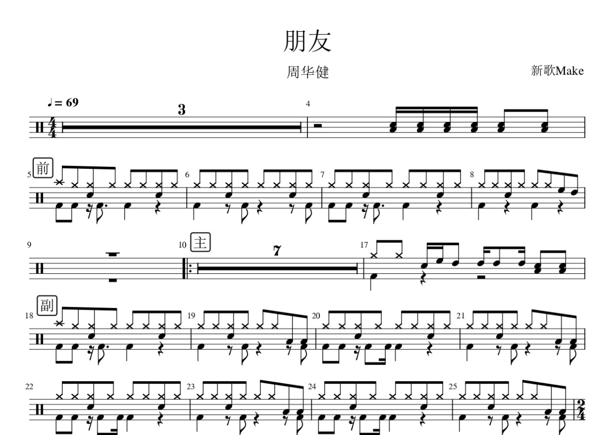 《朋友》是周华健演唱的一首歌曲,这份鼓谱共有两张高清图谱,图谱由 @打鼓谱 编配上传,图谱使用五线谱编配,使用这份朋友架子鼓谱,你将能够轻松地敲打出这首周华健的朋友,快来尝试吧。《朋友》是周华健演唱的一首歌曲(代表作),由刘思铭作词,刘志宏作曲,洪敬尧编曲,刘志宏、刘思铭担任制作人,收录在周华健1997年4月16日由滚石唱片发行的同名专辑《朋友》中.。