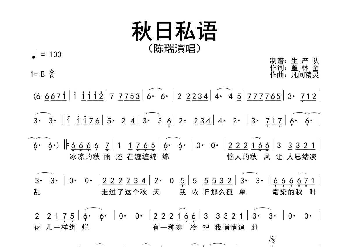 《秋日私语》是陈瑞演唱的一首歌曲,原版简谱,拍号为6/8拍,歌曲速度为每分钟100拍,这份简谱共有一张高清图谱,图谱由 @生产队 编配上传陈瑞演唱的经典歌曲《秋日私语》原版简谱,完整的前奏、间奏和solo编配。