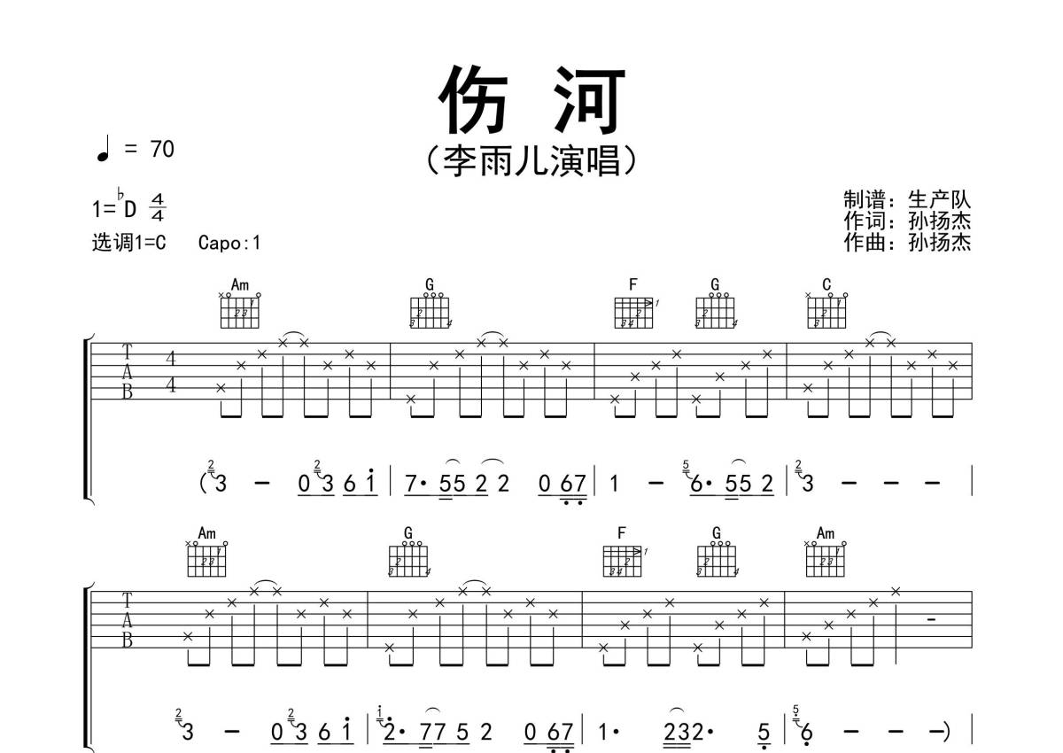 《伤河》是李雨儿演唱的一首歌曲,精编完美版,拍号为4/4拍,歌曲速度为每分钟70拍,歌曲原调为Db调,但由于原调指法比较难,为了方便弹奏,本吉他谱采用的是C调指法编配,变调夹1品弹奏即为原调,当然也可以根据自己的音域改变变调夹位置,或者通过改变和弦调性,以方便自己弹奏,这份吉他谱共有三张高清图谱,图谱由 @生产队 编配上传,图谱使用六线谱编配,包含吉他和弦指法、简谱以及歌词部分,使用这份伤河吉他谱,可以让你更加方便地掌握这首歌曲的弹唱技巧,快来尝试吧。《伤河》是李雨儿演唱的一首流行歌曲,由孙扬杰填词、谱曲。本吉他谱根据原版C调指法编配,完整的前奏、间奏、尾奏和solo编配,精编完美版,值得推荐的抒情歌曲。爱情如同战场,谁赢谁称帝王,一片情思像热血流淌,情路如此漫长;爱情如同战场,谁死谁的心上,爱人啊你可知我忧伤,来时路上荒凉 。
