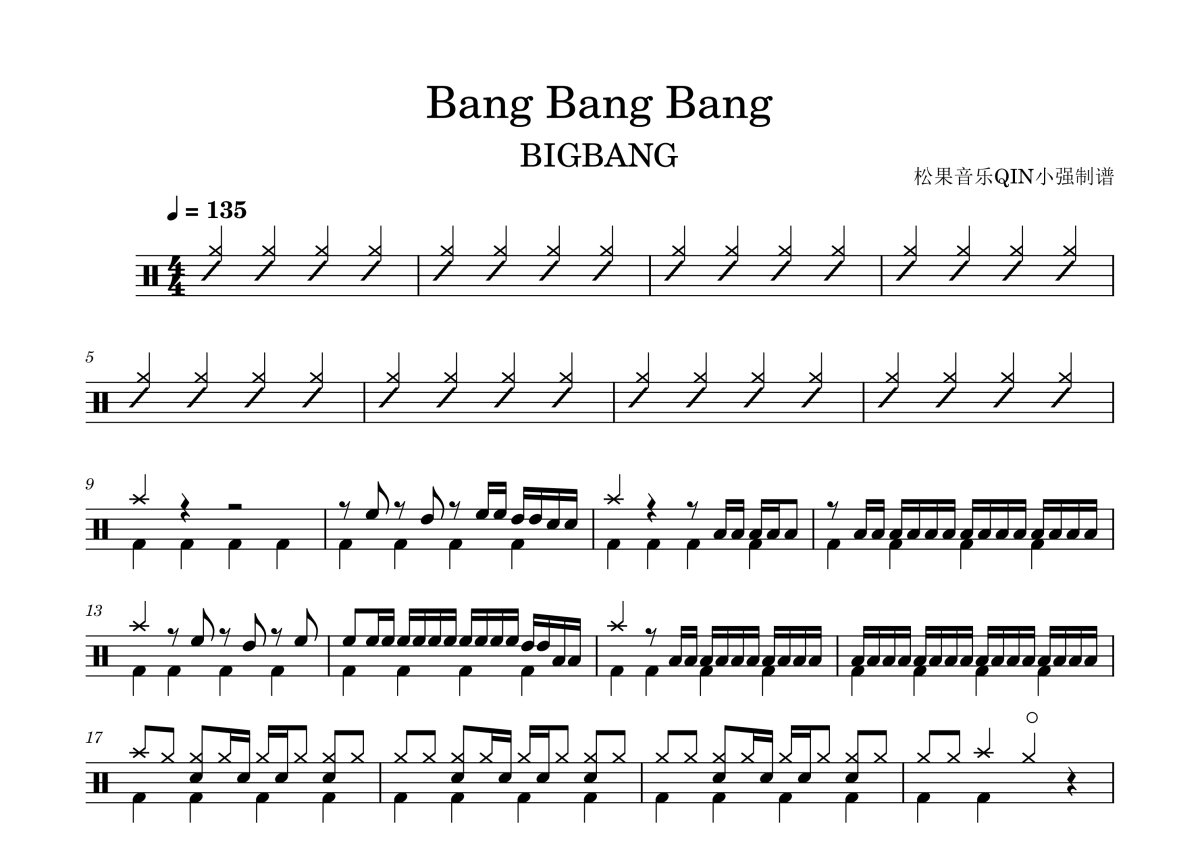 《Bang Bang Bang》是BIGBANG演唱的一首歌曲,这份架子鼓谱共有三张高清图谱,图谱由 @琴魂用户_219398 编配上传,图谱使用五线谱编配,使用这份Bang Bang Bang架子鼓谱,你将能够轻松地敲打出这首BIGBANG的Bang Bang Bang,快来尝试吧。《BANG BANG BANG》是韩国男团BIGBANG演唱的歌曲,由G-DRAGON、T.O.P以及YG娱乐代表制作人Teddy共同创作,收录于BIGBANG《MADE SERIES》系列第二张专辑《A》中,于2015年6月1日发行。