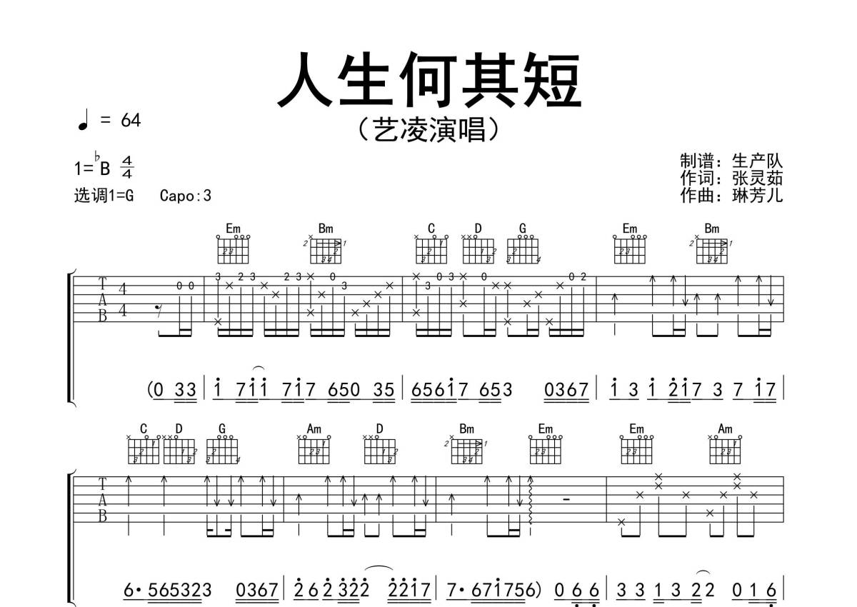 《人生何其短》是艺凌演唱的一首歌曲,精编完美版,拍号为4/4拍,歌曲速度为每分钟64拍,歌曲原调为Bb调,但由于原调指法比较难,为了方便弹奏,本吉他谱采用的是G调指法编配,变调夹3品弹奏即为原调,当然也可以根据自己的音域改变变调夹位置,或者通过改变和弦调性,以方便自己弹奏,这份吉他谱共有三张高清图谱,图谱由 @生产队 编配上传,图谱使用六线谱编配,包含吉他和弦指法、简谱以及歌词部分,使用这份人生何其短吉他谱,可以让你更加方便地掌握这首歌曲的弹唱技巧,快来尝试吧。《人生何其短》是歌手艺凌最新上线的伤感情歌。本吉他谱根据原版G调指法编配,完整的前奏、间奏、尾奏和solo编配,精编一音不差版,值得推荐。人生何其短,人生路漫漫,要怎么走过这一趟人间,太多的委屈,太多的辛酸,太多太多苦涩一个人吞咽。