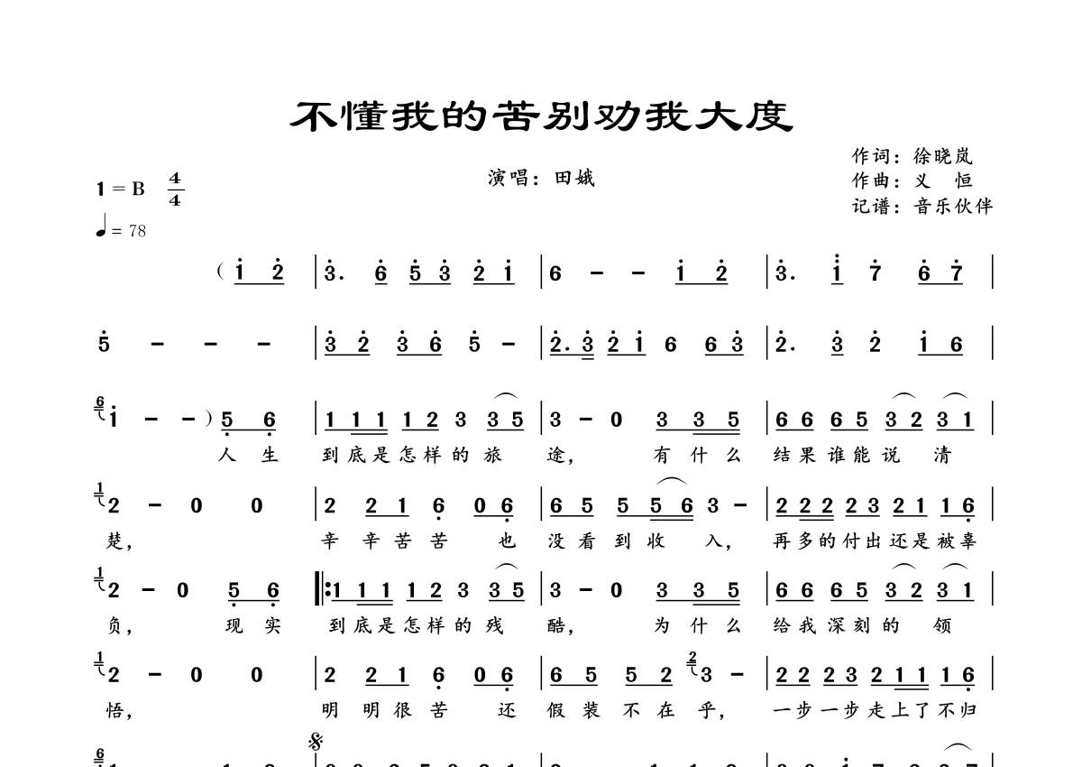 《不懂我的苦别劝我大度》是田娥演唱的一首歌曲,拍号为4/4拍,歌曲速度为每分钟78拍,这份简谱共有一张高清图谱,图谱由 @音乐伙伴 编配上传。