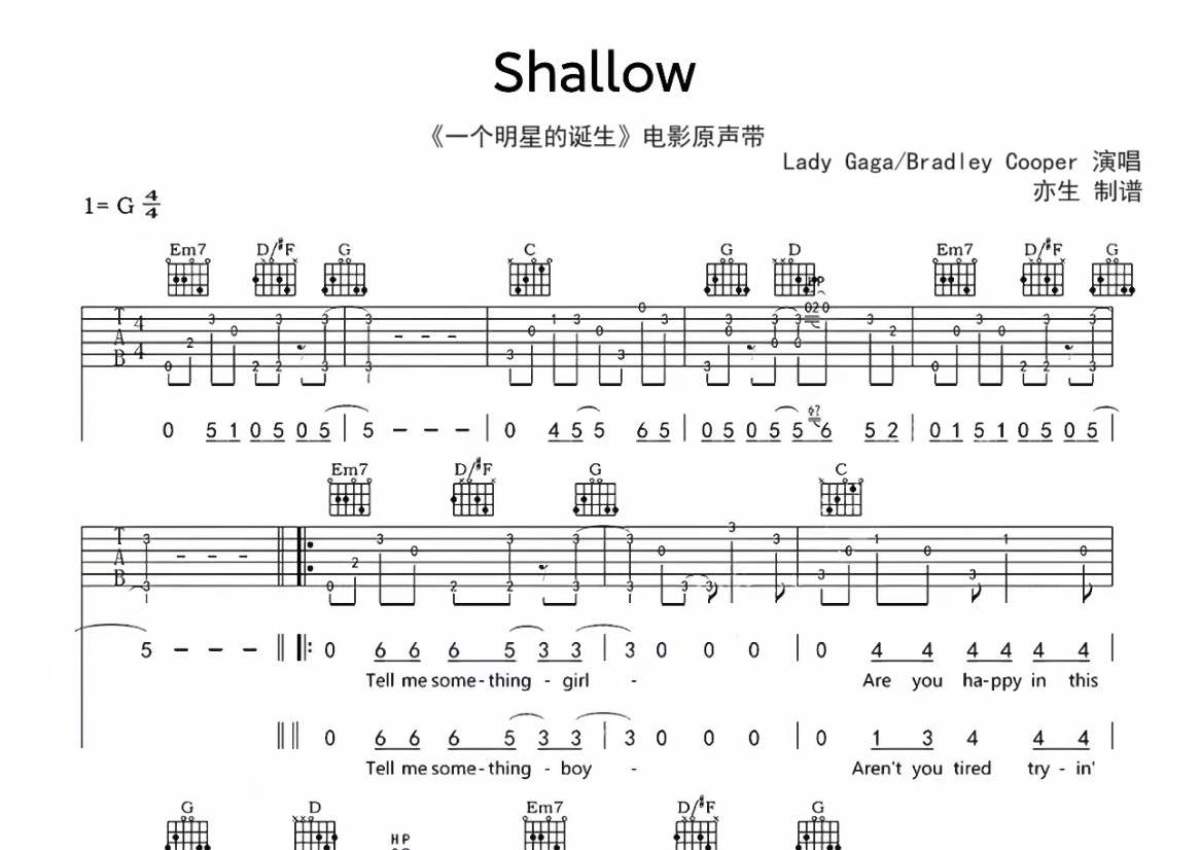 Lady Gaga/Bradley Cooper《Shallow》吉他谱 - G调弹唱六线谱