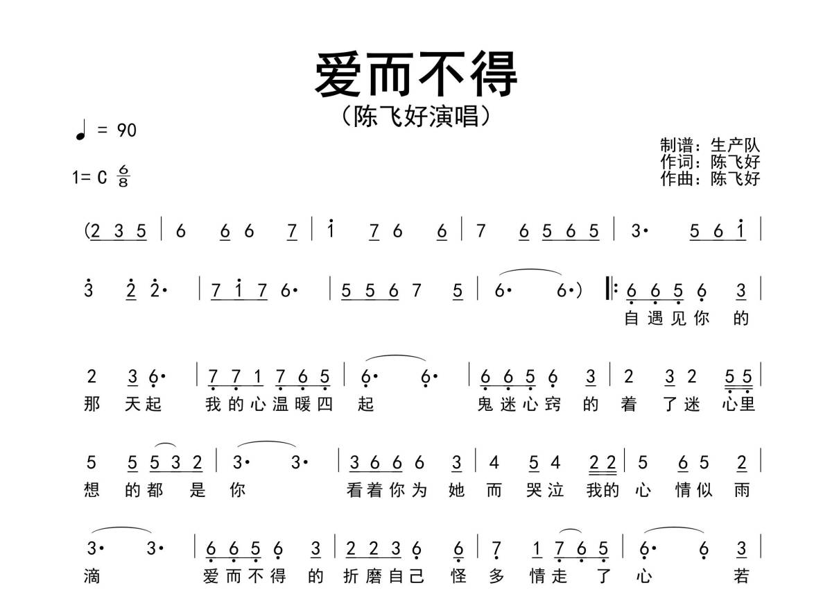 《爱而不得》是陈飞好演唱的一首歌曲,原版简谱,拍号为6/8拍,歌曲速度为每分钟90拍,这份简谱共有一张高清图谱,图谱由 @生产队 编配上传陈飞好演唱的歌曲《爱而不得》原版简谱,完整的前奏、间奏和solo编配。