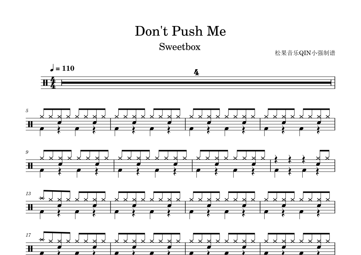 《Don't Push Me》是Sweetbox演唱的一首歌曲,拍号为4/4拍,这份架子鼓谱共有两张高清图谱,图谱由 @松果音乐QIN小强 编配上传,图谱使用五线谱编配,使用这份Don't Push Me架子鼓谱,你将能够轻松地敲打出这首Sweetbox的Don't Push Me,快来尝试吧。《Dont Push Me》是由蒂娜·哈里斯(Tina Harris)作为主唱的糖果盒子组合(Sweetbox)演唱的一首歌曲 。收录于爱贝克思娱乐(Avex Entertainment Inc.)公司2002年1月1日发行的专辑《Jade》中。