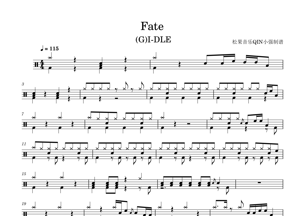 《Fate》是(G)I-DLE演唱的一首歌曲,拍号为4/4拍,这份架子鼓谱共有两张高清图谱,图谱由 @松果音乐QIN小强 编配上传,图谱使用五线谱编配,使用这份Fate架子鼓谱,你将能够轻松地敲打出这首(G)I-DLE的Fate,快来尝试吧。《Fate》(나는 아픈 건 딱 질색이니까)是韩国女子演唱组合(G)I-DLE演唱的歌曲,由田小娟作词,田小娟、Pop Time、Daily、Likey作曲,收录在组合于2024年1月29日发行的第二张正规专辑中 。 2024年3月31日起,《Fate》连续三周获得了韩国音乐节目《人气歌谣》的一位奖杯 。此外,该曲还登上了韩国六家主流音乐平台实时榜单、日间榜单和iChart实时榜单、周榜的冠军,达成了“完美全杀”,这是组合第4支取得该成绩的歌曲,也是组合首支取得该成绩的非主打收录曲 。