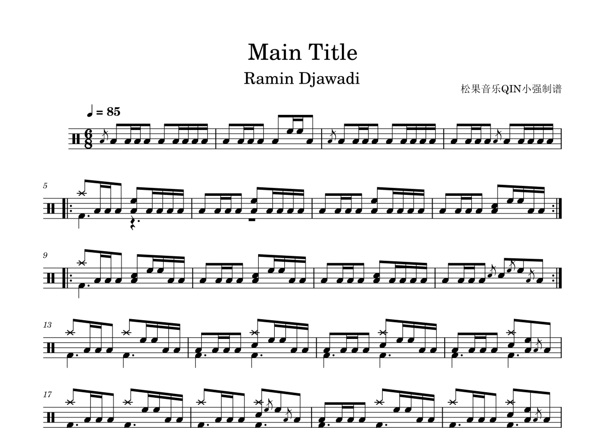 《Main Title》是权力的游戏演唱的一首歌曲,这份架子鼓谱共有一张高清图谱,图谱由 @松果音乐QIN小强 编配上传,图谱使用五线谱编配,使用这份Main Title架子鼓谱,你将能够轻松地敲打出这首权力的游戏的Main Title,快来尝试吧。权力的游戏主题其Main Title。