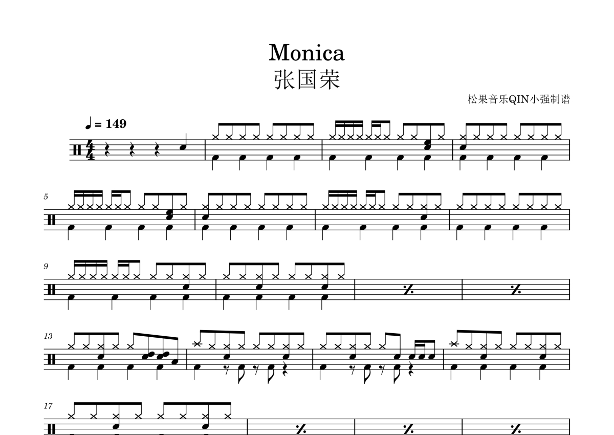 《monica》是张国荣演唱的一首歌曲,拍号为4/4拍,这份架子鼓谱共有四张高清图谱,图谱由 @松果音乐QIN小强 编配上传,图谱使用五线谱编配,使用这份monica架子鼓谱,你将能够轻松地敲打出这首张国荣的monica,快来尝试吧。《Monica》是张国荣演唱的一首粤语歌曲,由吉川晃司作曲,黎彼得填词,收录于张国荣1984年发行的专辑《Leslie》中。 1984年这首歌曲获得了十大中文金曲以及十大劲歌金曲奖。1999年,该首歌曲在第22届十大中文金曲颁奖典礼上获得“20世纪百年十大金曲奖”。