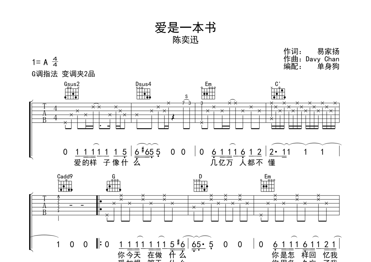 陈奕迅《爱是一本书》吉他谱 - G调弹唱六线谱