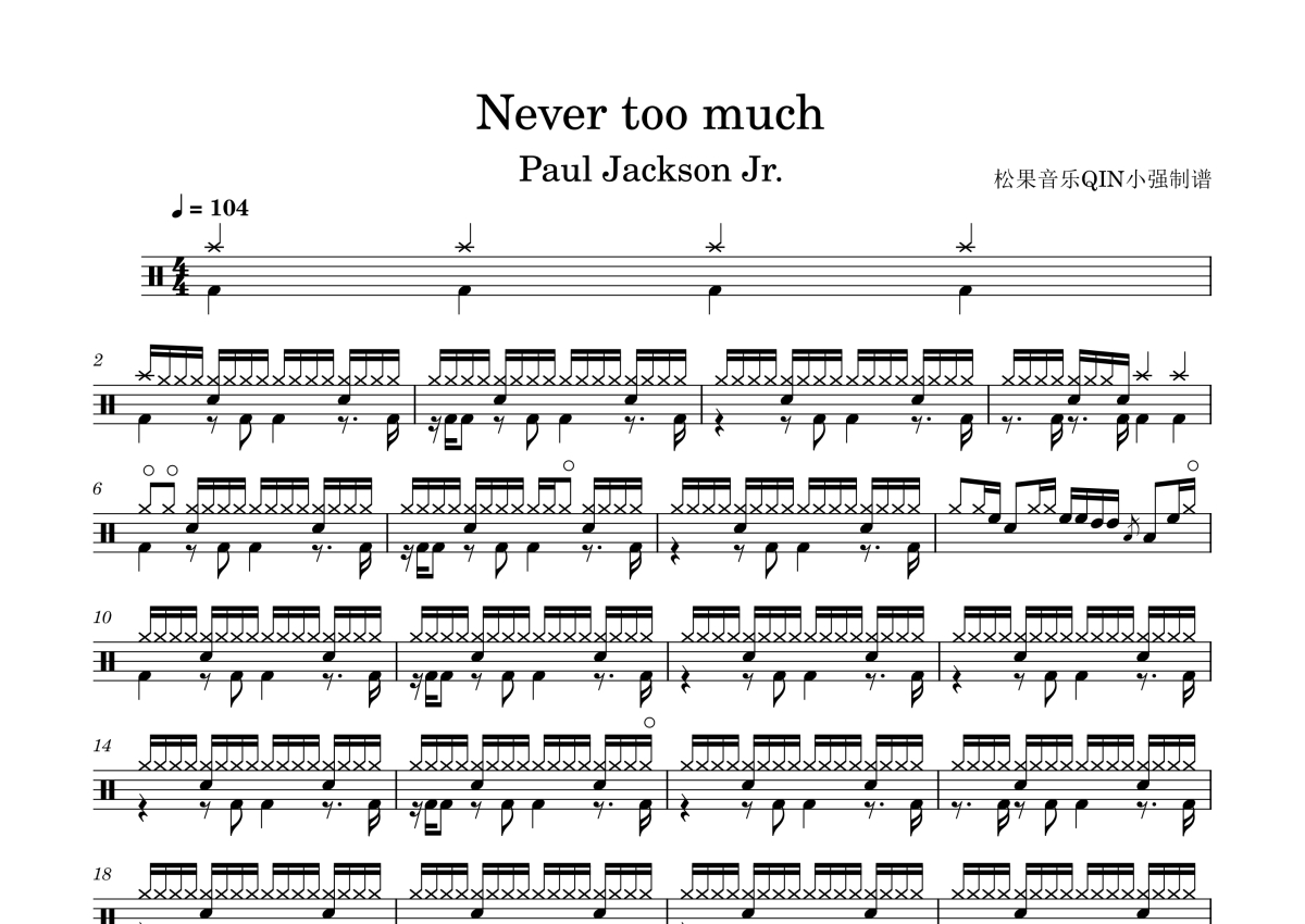 《Never too much》是Paul Jackson Jr演唱的一首歌曲,这份架子鼓谱共有三张高清图谱,图谱由 @松果音乐QIN小强 编配上传,图谱使用五线谱编配,使用这份Never too much架子鼓谱,你将能够轻松地敲打出这首Paul Jackson Jr的Never too much,快来尝试吧。Never too much Paul Jackson Jr。