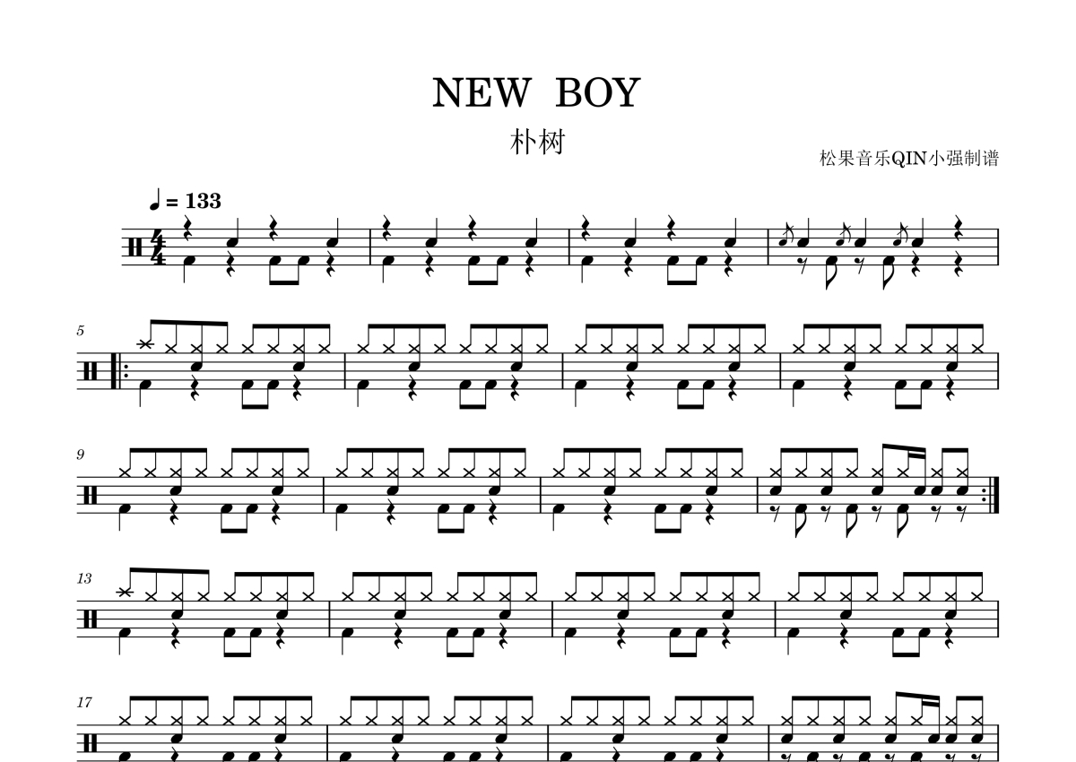 《NEW BOY》是朴树演唱的一首歌曲,拍号为4/4拍,这份架子鼓谱共有三张高清图谱,图谱由 @松果音乐QIN小强 编配上传,图谱使用五线谱编配,使用这份NEW BOY架子鼓谱,你将能够轻松地敲打出这首朴树的NEW BOY,快来尝试吧。《NEW BOY》是朴树作词、作曲并演唱的一首歌曲,收录在朴树于1999年1月发行的个人首张录音室专辑《我去2000年》中 。 1999年6月,该曲获得南宁电台颁发的第三届中国原创十大金曲奖。