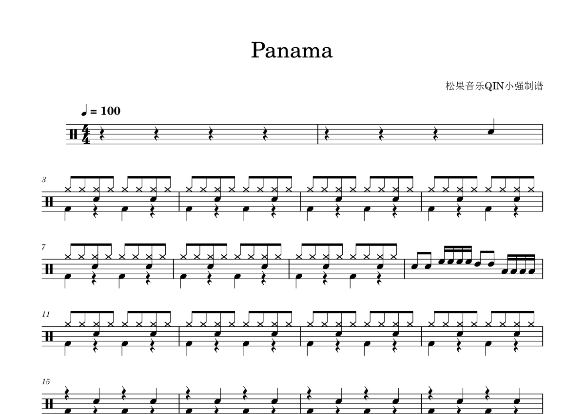 《Panama》是Matteo演唱的一首歌曲,拍号为4/4拍,这份架子鼓谱共有两张高清图谱,图谱由 @松果音乐QIN小强 编配上传,图谱使用五线谱编配,使用这份Panama架子鼓谱,你将能够轻松地敲打出这首Matteo的Panama,快来尝试吧。《Panama(巴拿马)》是罗马尼亚歌手Matteo作词、作曲并演唱的歌曲,收录于专辑《Panama》中,于2013年10月2日通过Media Pro Music和Orchard Enterprises NY Inc正式发行。
