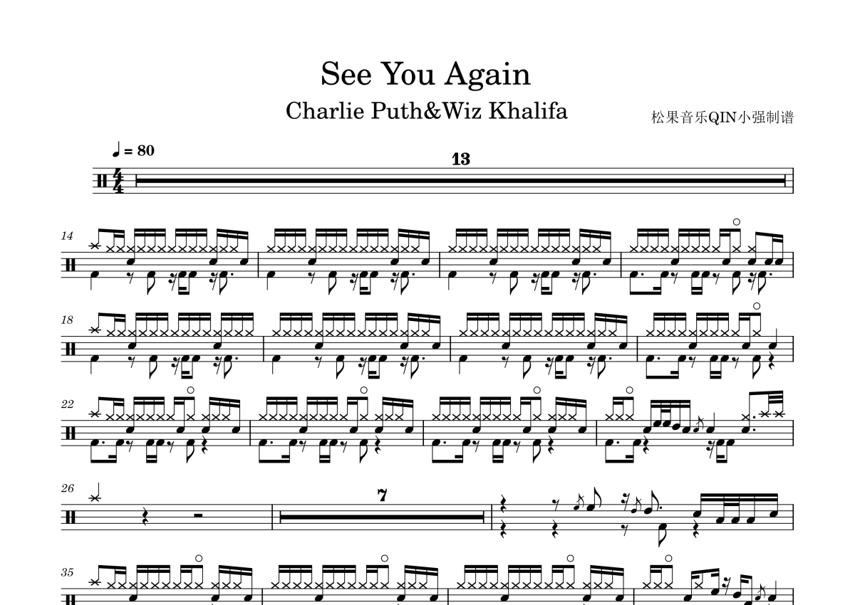 《See You Again》是Wiz Khalifa&Charlie Puth演唱的一首歌曲,拍号为4/4拍,这份架子鼓谱共有两张高清图谱,图谱由 @松果音乐QIN小强 编配上传,图谱使用五线谱编配,使用这份See You Again架子鼓谱,你将能够轻松地敲打出这首Wiz Khalifa&Charlie Puth的See You Again,快来尝试吧。《See You Again》是由美国说唱歌手维兹·卡利法与美国男歌手查理·普斯合作演唱的一首歌曲,词曲由DJ Frank E、查理·普斯、维兹·卡利法和安德鲁·希达尔等人共同创作完成,该曲作为电影《速度与激情7》的片尾曲和主题曲于2015年3月17日发行 ,被收录在电影的原声音乐专辑和查理·普斯于2016年1月29日发行的个人首张录音室专辑《Nine Track Mind》中。