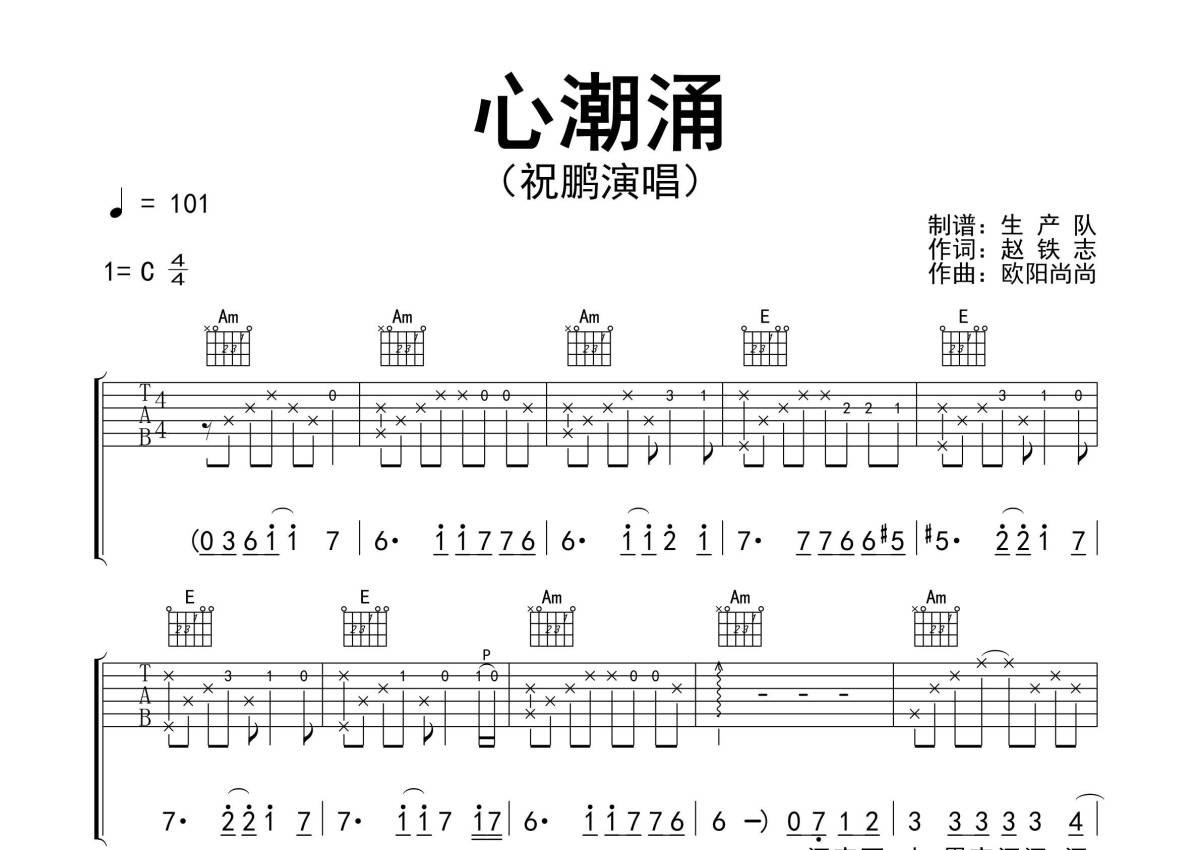 《心潮涌》是祝鹏演唱的一首歌曲,精编完美版,拍号为4/4拍,歌曲速度为每分钟101拍,歌曲原调为C调,本吉他谱采用的是C调指法编配,演奏时不需要使用变调夹即为原调,这份吉他谱共有三张高清图谱,图谱由 @生产队 编配上传,图谱使用六线谱编配,包含吉他和弦指法、简谱以及歌词部分,使用这份心潮涌吉他谱,可以让你更加方便地掌握这首歌曲的弹唱技巧,快来尝试吧。《心潮涌》是歌手祝鹏演唱的粤语歌曲。本吉他谱根据原版C调指法编配,完整的前奏、间奏、尾奏和solo编配,精编完美版,值得推荐的一首抒情歌曲。深夜雨中,黑夜深深深,心中眺望,感觉冷冷冷,再不能再与她心抱拥,此刻路上谁懂我的苦衷。