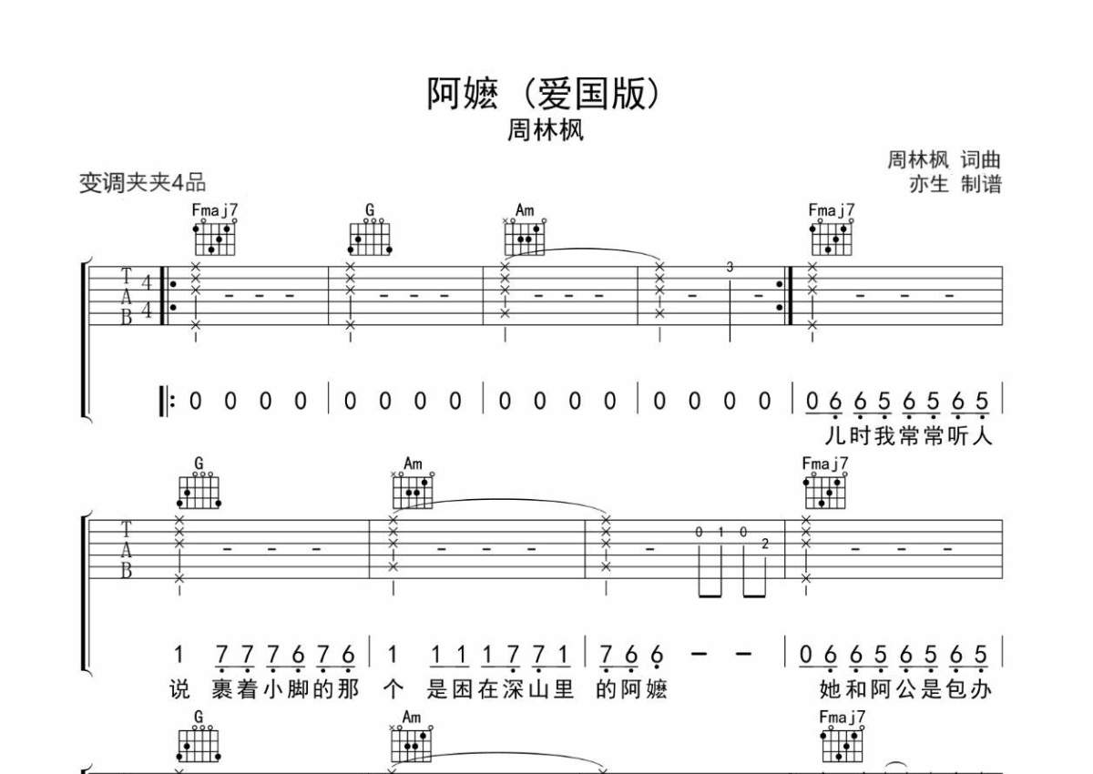 《阿嬷》是周林枫演唱的一首歌曲,拍号为4/4拍,歌曲原调为E调,但由于原调指法比较难,为了方便弹奏,本吉他谱采用的是C调指法编配,变调夹4品弹奏即为原调,当然也可以根据自己的音域改变变调夹位置,或者通过改变和弦调性,以方便自己弹奏,这份吉他谱共有两张高清图谱,图谱由 @亦生 编配上传,图谱使用六线谱编配,包含吉他和弦指法、简谱以及歌词部分,使用这份阿嬷吉他谱,可以让你更加方便地掌握这首歌曲的弹唱技巧,快来尝试吧。