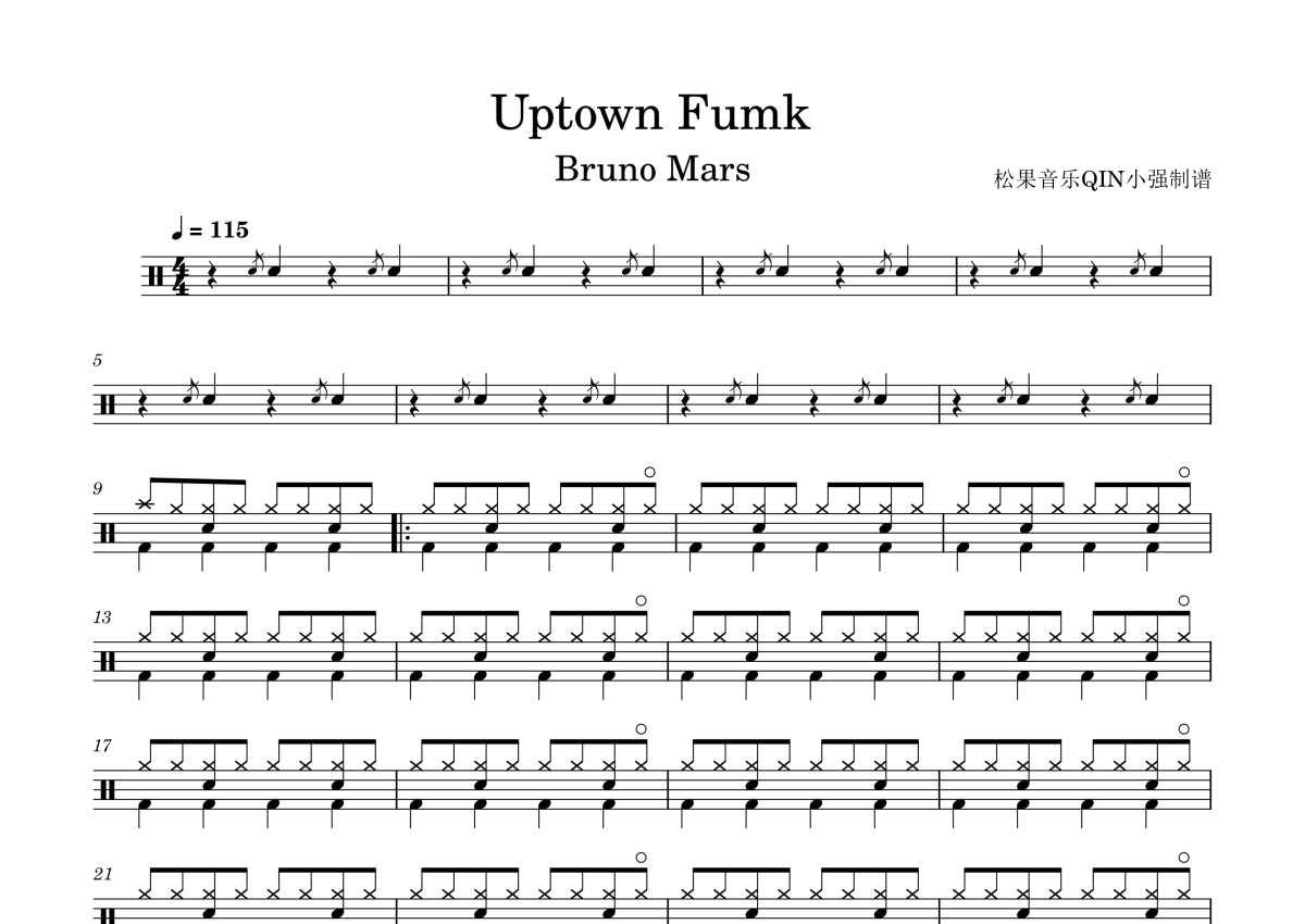 《Uptown Fumk》是布鲁诺·马尔斯演唱的一首歌曲,拍号为4/4拍,这份架子鼓谱共有两张高清图谱,图谱由 @松果音乐QIN小强 编配上传,图谱使用五线谱编配,使用这份Uptown Fumk架子鼓谱,你将能够轻松地敲打出这首布鲁诺·马尔斯的Uptown Fumk,快来尝试吧。《Uptown Funk》是布鲁诺·马尔斯演唱的一首歌曲,词曲由马克·容森、布鲁诺·马尔斯、杰夫·巴斯科尔等人共同创作,作为单曲于2014年11月10日发行,后收录至马克·容森的个人第四张录音室专辑《Uptown Special》中。