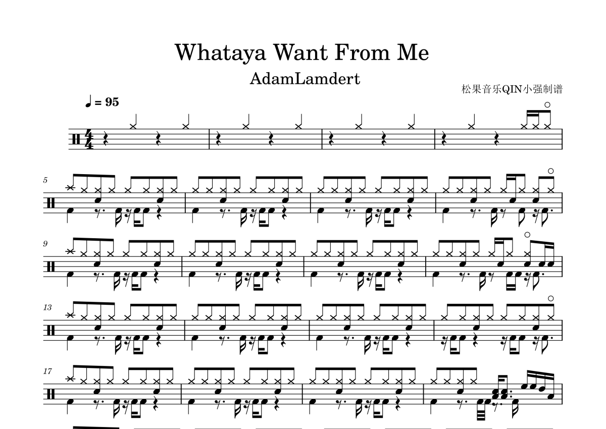 《Whataya Want From Me》是Adam Lambert演唱的一首歌曲,拍号为4/4拍,这份架子鼓谱共有三张高清图谱,图谱由 @松果音乐QIN小强 编配上传,图谱使用五线谱编配,使用这份Whataya Want From Me架子鼓谱,你将能够轻松地敲打出这首Adam Lambert的Whataya Want From Me,快来尝试吧。《Whataya Want From Me》是由美国歌手亚当·兰伯特演唱的歌曲,由P!nk作词、马克斯·马丁和史奇·雷克斯、P!nk共同作曲,收录在亚当·兰伯特的专辑《For Your Entertainment》中,歌曲于2009年11月24日由美国广播唱片公司和19娱乐共同发行。