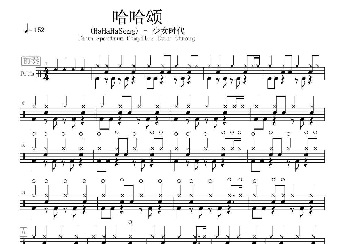 《哈哈颂》是少女时代演唱的一首歌曲,这份鼓谱共有三张高清图谱,图谱由 @打鼓谱 编配上传,图谱使用五线谱编配,使用这份哈哈颂架子鼓谱,你将能够轻松地敲打出这首少女时代的哈哈颂,快来尝试吧。《哈哈颂(HaHaHaSong)》现场版。少女时代(Girls' Generation)是韩国SM娱乐有限公司于2007年推出的女子流行演唱团体,由金泰妍、李顺圭、黄美英、金孝渊、权俞利、崔秀英、林允儿和徐珠贤8人组成。