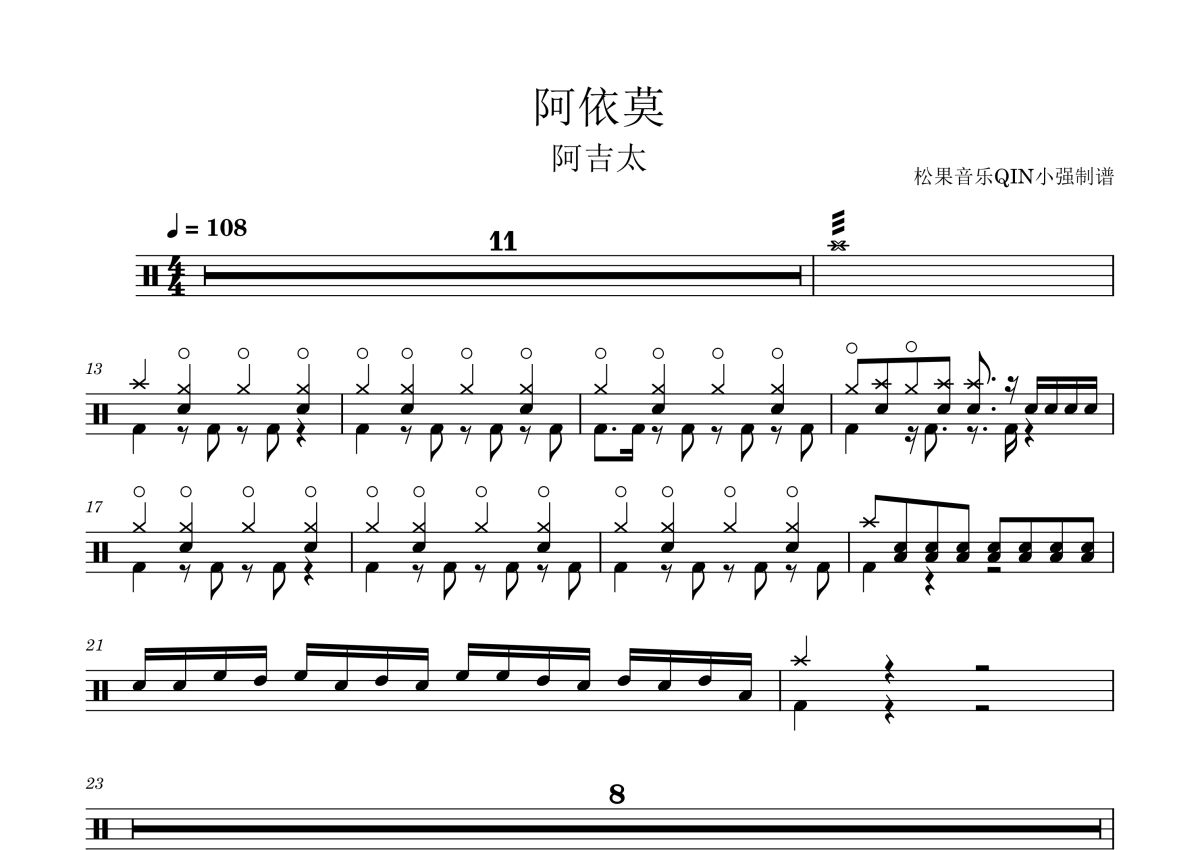 《阿依莫》是阿吉太演唱的一首歌曲,拍号为4/4拍,这份架子鼓谱共有四张高清图谱,图谱由 @松果音乐QIN小强 编配上传,图谱使用五线谱编配,使用这份阿依莫架子鼓谱,你将能够轻松地敲打出这首阿吉太的阿依莫,快来尝试吧。阿衣莫 阿吉太组合 作词: 吉子古且 作曲: 吉子古且 作曲: 吉子古且 作词: 吉子古且。