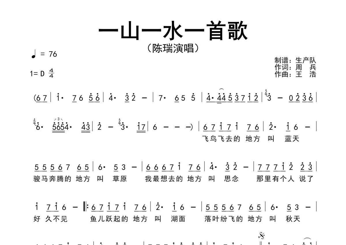 《一山一水一首歌》是陈瑞演唱的一首歌曲,原版简谱,拍号为4/4拍,歌曲速度为每分钟76拍,这份简谱共有一张高清图谱,图谱由 @生产队 编配上传陈瑞演唱的歌曲《一山一水一首歌》原版简谱,完整的前奏、间奏和solo编配。