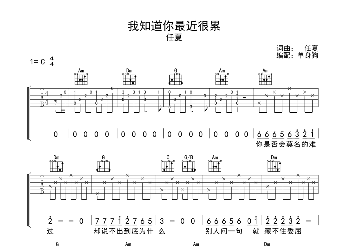 我知道你最近很累吉他谱 - 任夏 - C调弹唱六线谱