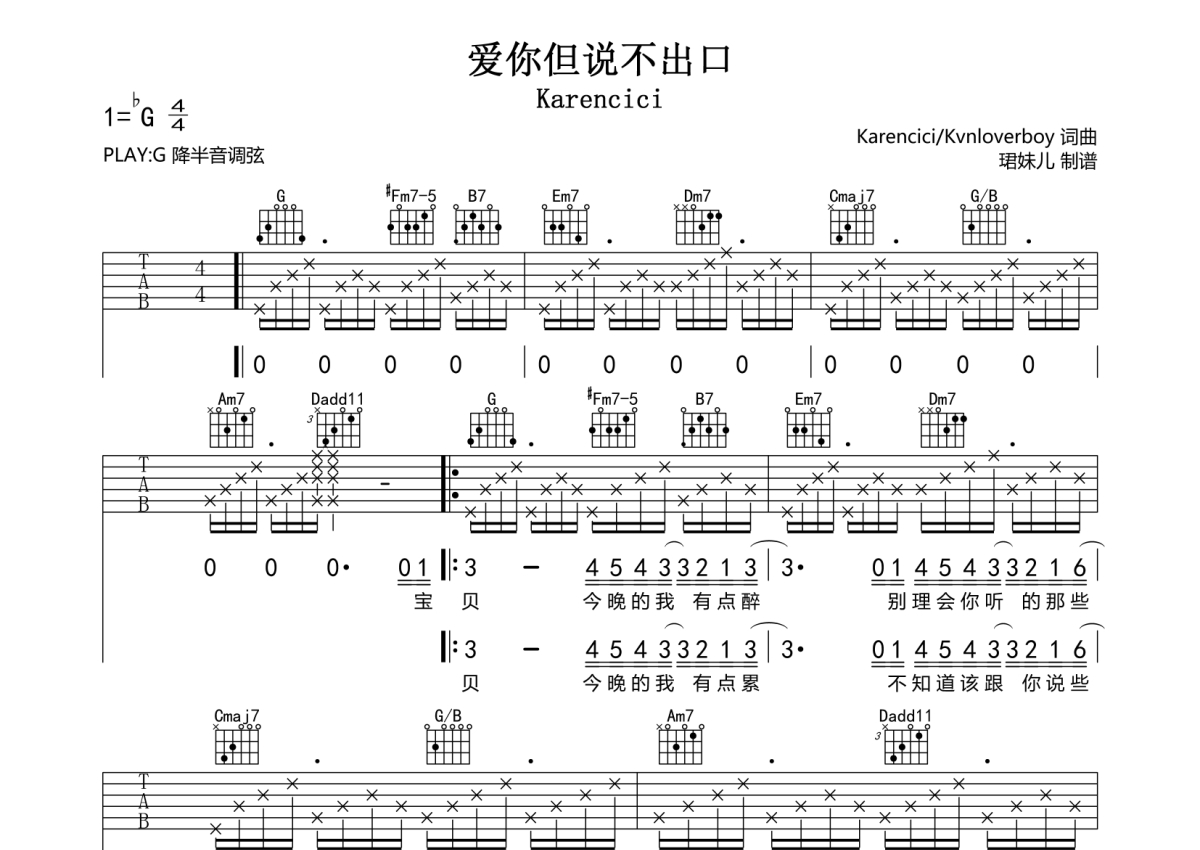 爱你但说不出口吉他谱 - Karencici - G调弹唱六线谱