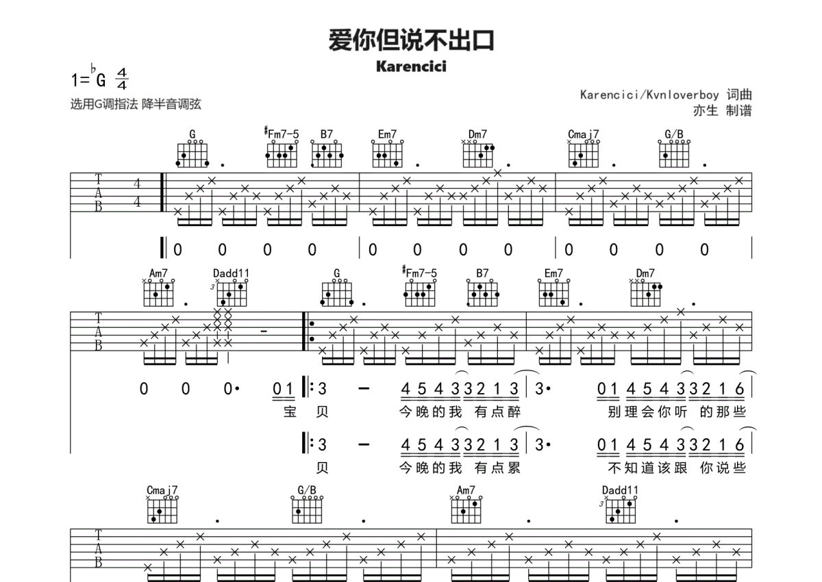 Karencici《爱你但说不出口》吉他谱 - G调弹唱六线谱