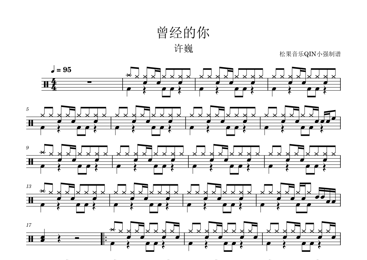 《曾经的你》是许巍演唱的一首歌曲,拍号为4/4拍,这份架子鼓谱共有两张高清图谱,图谱由 @松果音乐QIN小强 编配上传,图谱使用五线谱编配,使用这份曾经的你架子鼓谱,你将能够轻松地敲打出这首许巍的曾经的你,快来尝试吧。《曾经的你》是由许巍作词、作曲,由许巍演唱的一首歌曲。收录在2004年12月9日发行的专辑《每一刻都是崭新的》中。这首歌是一首流行风格的歌曲。歌曲展现了许巍高超的唱功及创作功力。