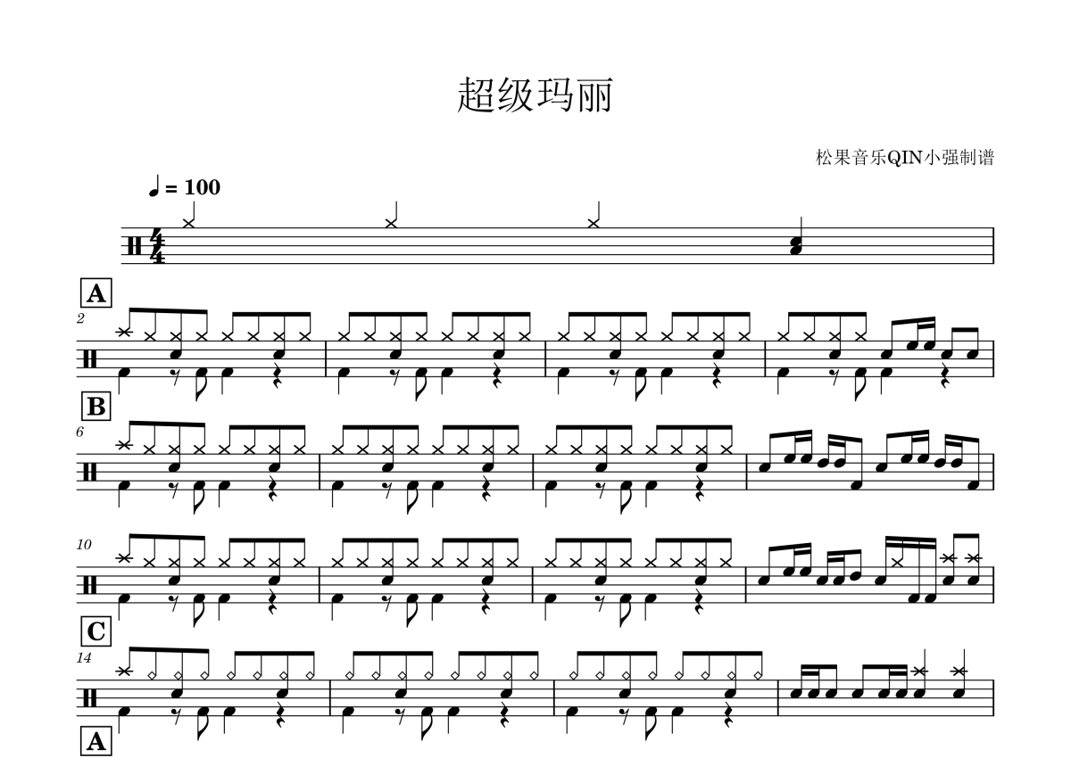 《超级玛丽》是超级玛丽演唱的一首歌曲,这份架子鼓谱共有两张高清图谱,图谱由 @松果音乐QIN小强 编配上传,图谱使用五线谱编配,使用这份超级玛丽架子鼓谱,你将能够轻松地敲打出这首超级玛丽的超级玛丽,快来尝试吧。《超级马力欧兄弟》是任天堂情报开发本部开发的Family Computer横版卷轴动作游戏,为《超级马力欧兄弟》系列的第1作,于1985年9月13日发售。