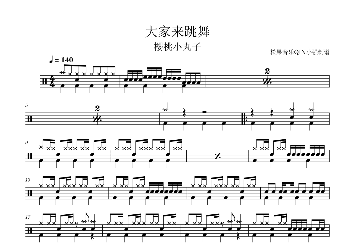 《大家来跳舞》是B.B.QUEENS演唱的一首歌曲,拍号为4/4拍,这份架子鼓谱共有两张高清图谱,图谱由 @松果音乐QIN小强 编配上传,图谱使用五线谱编配,使用这份大家来跳舞架子鼓谱,你将能够轻松地敲打出这首B.B.QUEENS的大家来跳舞,快来尝试吧。《大家来跳舞》是日本乐队B.B.QUEENS演唱的歌曲,由樱桃子作词,织田哲郎作曲及编曲 ,收录在乐队的同名出道单曲EP中,于1990年4月4日发行。