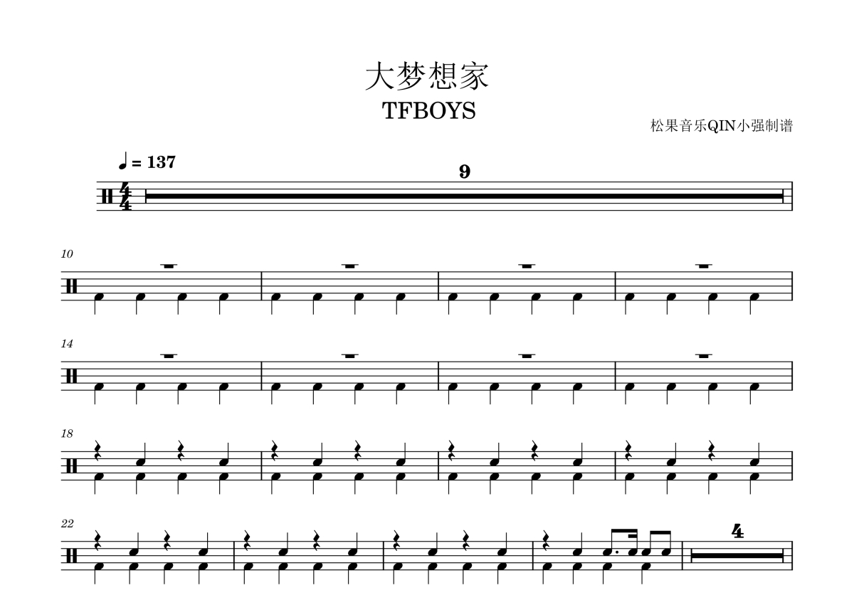 《大梦想家》是tfboys演唱的一首歌曲,拍号为4/4拍,这份架子鼓谱共有三张高清图谱,图谱由 @松果音乐QIN小强 编配上传,图谱使用五线谱编配,使用这份大梦想家架子鼓谱,你将能够轻松地敲打出这首tfboys的大梦想家,快来尝试吧。《大梦想家》是TFBOYS演唱的一首歌曲,由王韵韵作词、刘佳作曲,电视剧《九州·天空城》的片尾曲、电视剧《小别离》的插曲,于2015年8月17日正式发布,收录在同名专辑《大梦想家》中。 2016年6月11日,该歌曲获得第9届城市至尊音乐榜年度20大金曲。