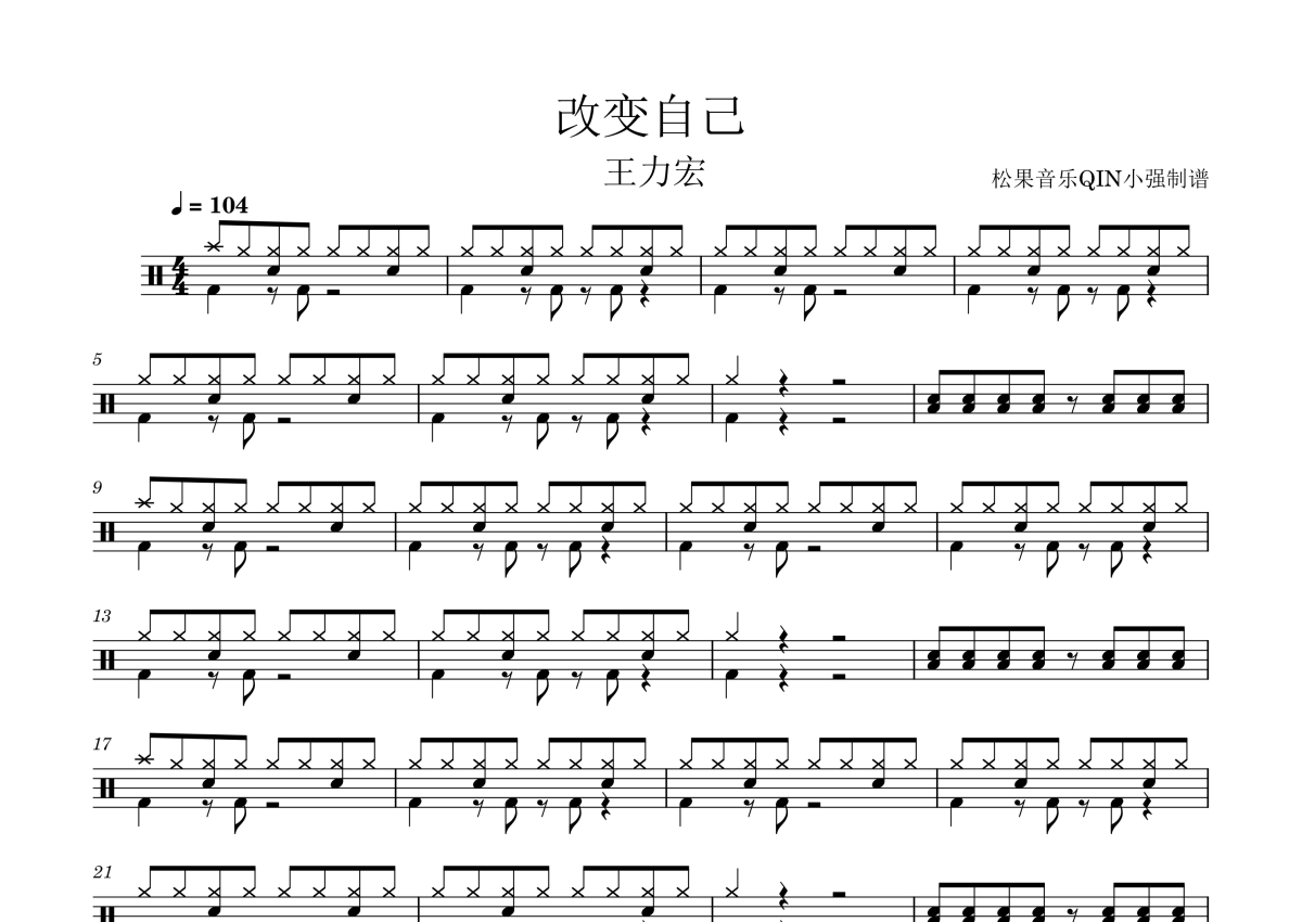 《改变自己》是王力宏演唱的一首歌曲,拍号为4/4拍,这份架子鼓谱共有两张高清图谱,图谱由 @松果音乐QIN小强 编配上传,图谱使用五线谱编配,使用这份改变自己架子鼓谱,你将能够轻松地敲打出这首王力宏的改变自己,快来尝试吧。《改变自己》是王力宏演唱的歌曲,由王力宏作词、作曲,收录在王力宏2007年7月13日发行的同名专辑《改变自己》中。
