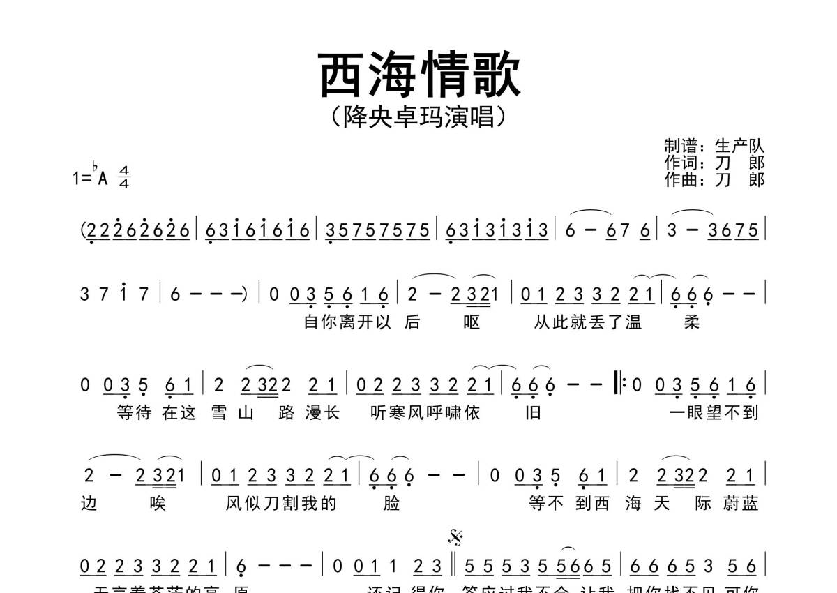 降央卓玛《西海情歌》简谱 - 原版简谱