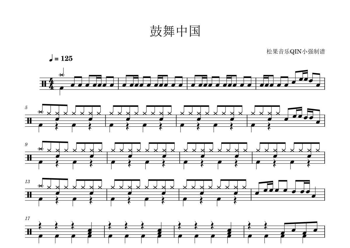 《鼓舞中国》是纯音乐演唱的一首歌曲,拍号为4/4拍,这份架子鼓谱共有两张高清图谱,图谱由 @松果音乐QIN小强 编配上传,图谱使用五线谱编配,使用这份鼓舞中国架子鼓谱,你将能够轻松地敲打出这首纯音乐的鼓舞中国,快来尝试吧。鼓舞中国。