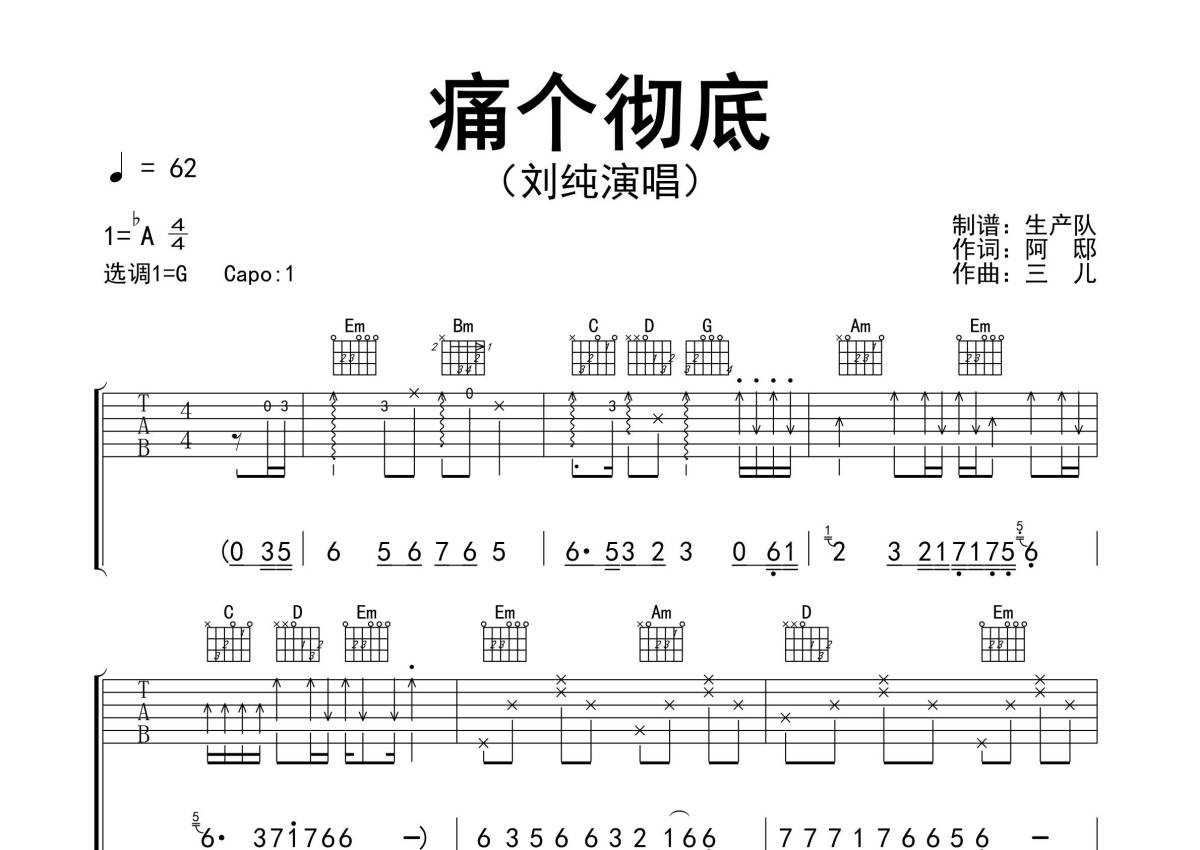 《痛个彻底》是刘纯演唱的一首歌曲,精编完美版,拍号为4/4拍,歌曲速度为每分钟62拍,歌曲原调为Ab调,但由于原调指法比较难,为了方便弹奏,本吉他谱采用的是G调指法编配,变调夹1品弹奏即为原调,当然也可以根据自己的音域改变变调夹位置,或者通过改变和弦调性,以方便自己弹奏,这份吉他谱共有三张高清图谱,图谱由 @生产队 编配上传,图谱使用六线谱编配,包含吉他和弦指法、简谱以及歌词部分,使用这份痛个彻底吉他谱,可以让你更加方便地掌握这首歌曲的弹唱技巧,快来尝试吧。《痛个彻底》是由歌手刘纯推出的最新单曲。本吉他谱根据原版G调指法编配,完整的前奏、间奏和solo编配,精编完美版,值得推荐的一首民谣歌曲。深夜的雨,我该感谢你,是你帮我把世界隔离,无人的街道没有人注意,伤心的我哭得肆意。