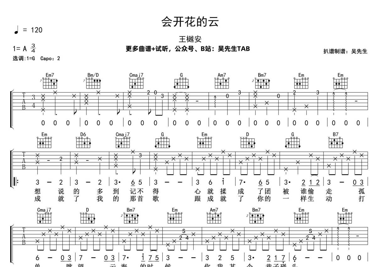 《会开花的云》是王樾安演唱的一首歌曲,拍号为3/4拍,歌曲速度为每分钟120拍,歌曲原调为A调,但由于原调指法比较难,为了方便弹奏,本吉他谱采用的是G调指法编配,变调夹2品弹奏即为原调,当然也可以根据自己的音域改变变调夹位置,或者通过改变和弦调性,以方便自己弹奏,这份吉他谱共有两张高清图谱,图谱由 @吴先生TAB 编配上传,图谱使用六线谱编配,包含吉他和弦指法、简谱以及歌词部分,曲谱配备了相关的音频提供试听,使用这份会开花的云吉他谱,可以让你更加方便地掌握这首歌曲的弹唱技巧,快来尝试吧。