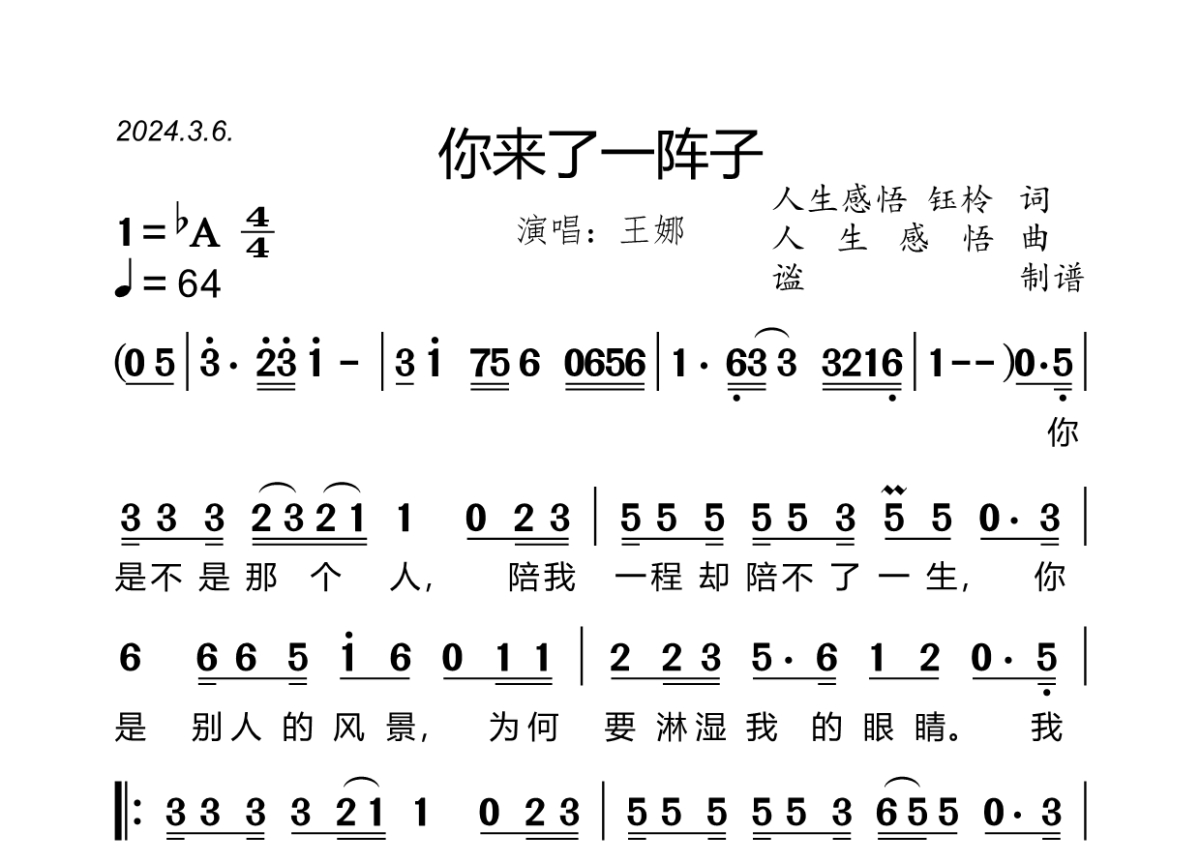 《你来了一阵子》是王娜演唱的一首歌曲,拍号为4/4拍,歌曲速度为每分钟64拍,这份简谱共有两张高清图谱,图谱由 @谧 编配上传王娜演唱的《你来了一阵子》,bA调,4/4拍,速度64,原版完整简谱(含前奏、间奏、尾奏),谧遵循歌手演唱旋律,精心制谱,共两页。