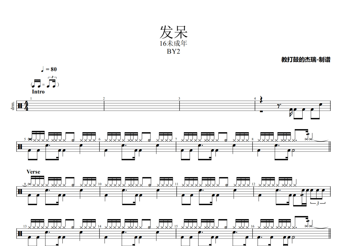 《发呆》是BY2演唱的一首歌曲,拍号为4/4拍,歌曲速度为每分钟80拍,这份架子鼓谱共有两张高清图谱,图谱由 @Jerry 编配上传,图谱使用五线谱编配,使用这份发呆架子鼓谱,你将能够轻松地敲打出这首BY2的发呆,快来尝试吧。